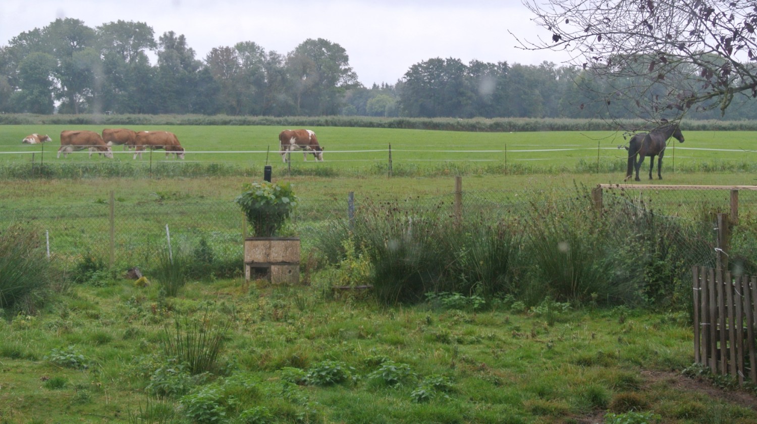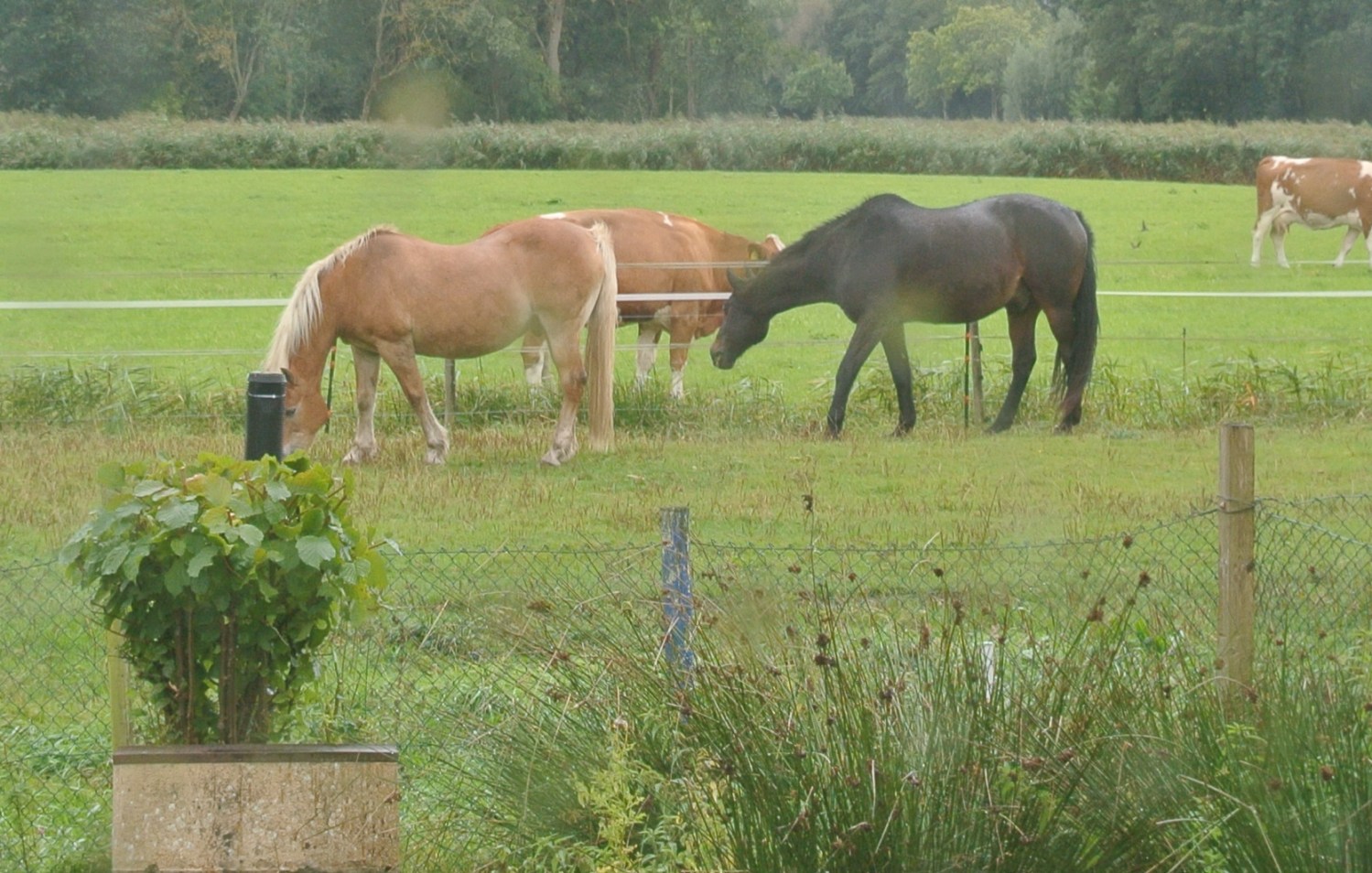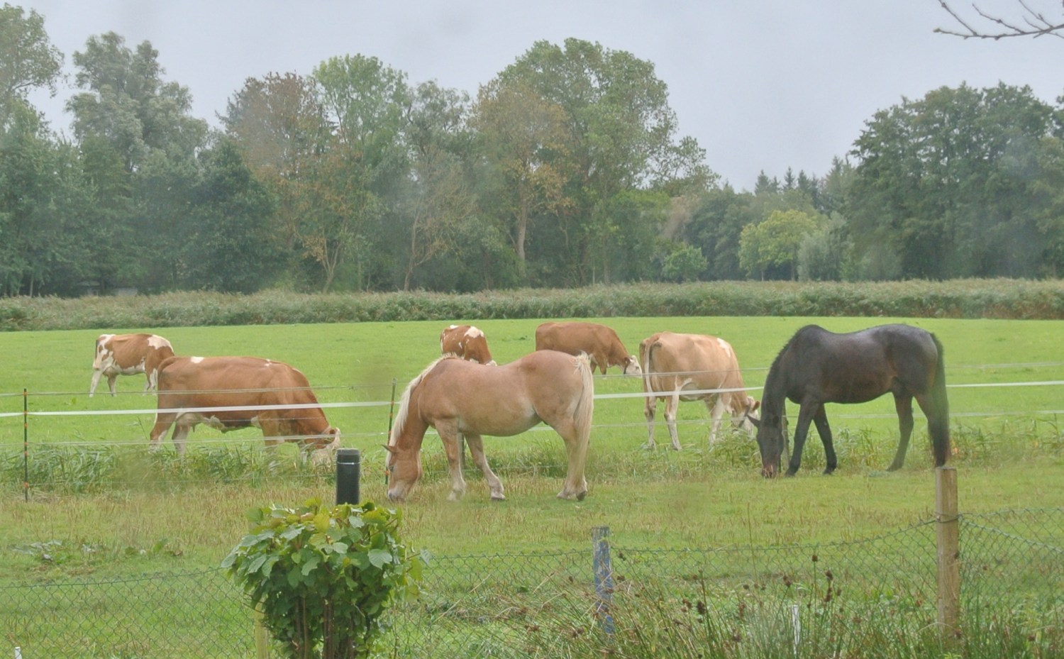 Da stehen sie friedlich zusammen: Kühe und Pferde.
