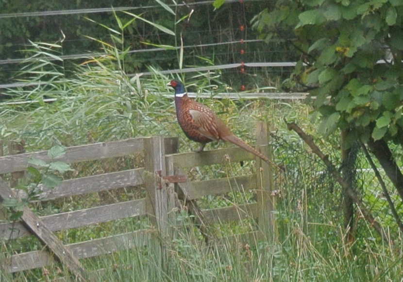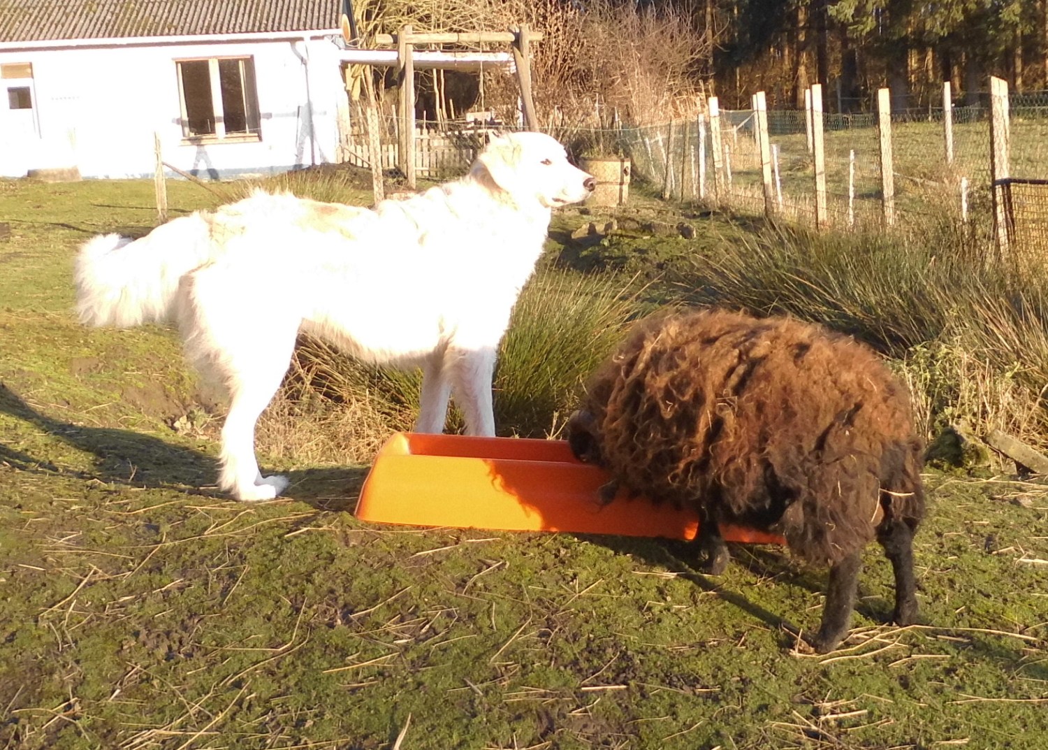 Das weiße Schäfchen Grandma interessiert das nicht. Der Fasan läuft oft zwischen den Schafen herum.