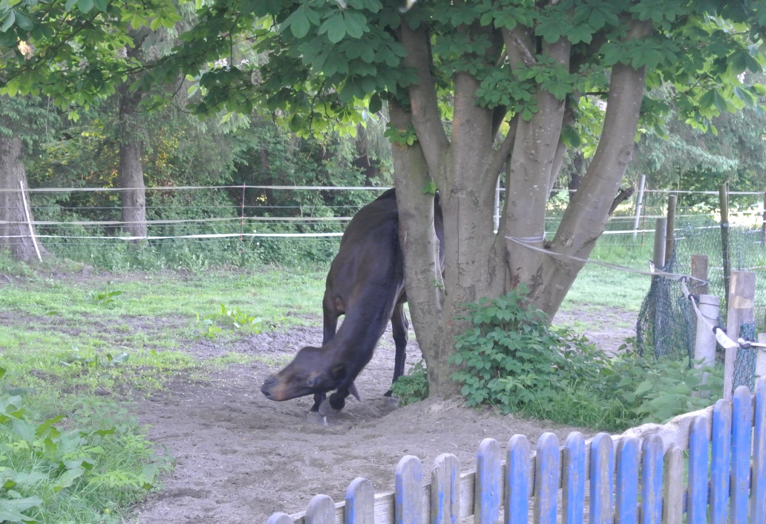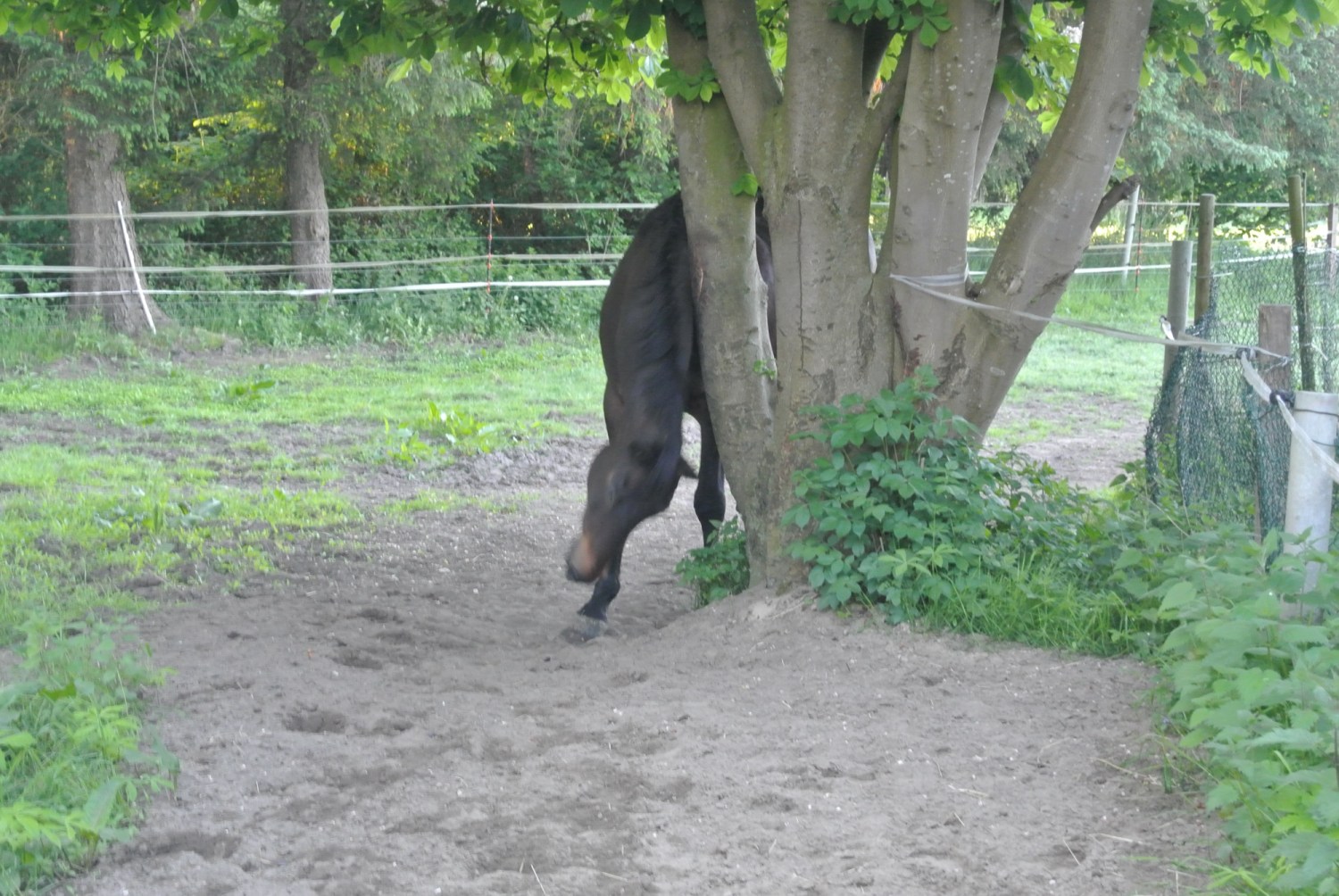 Beide Pferde knabbern gern mal an den Blättern der Bäume. Hier ist es Astron und die Kastanie.