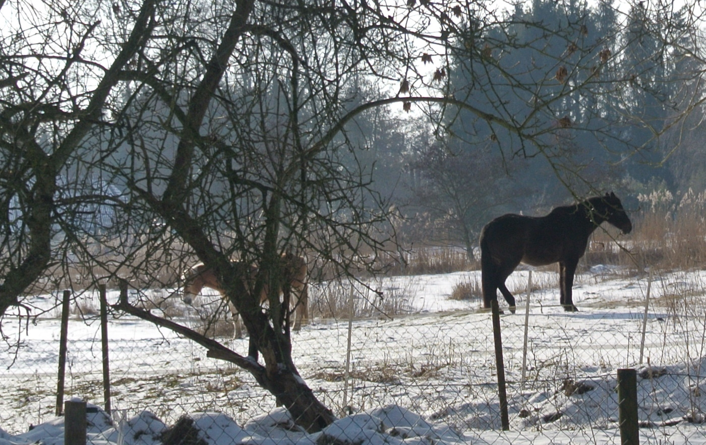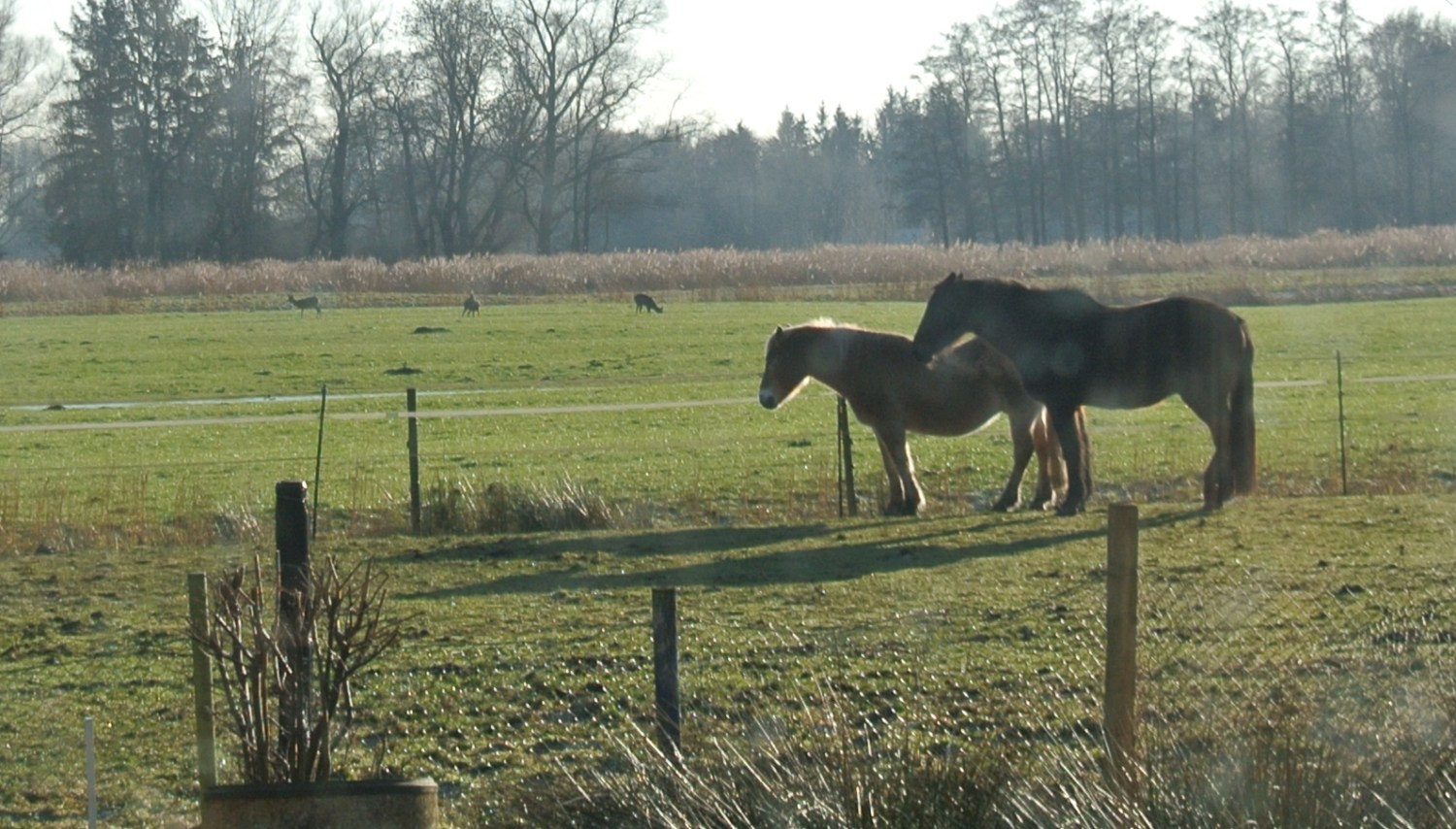 Hier seht ihr die Pferde und ein paar Rehe im Hintergrund, als der Schnee gerade weggeschmolzen war.