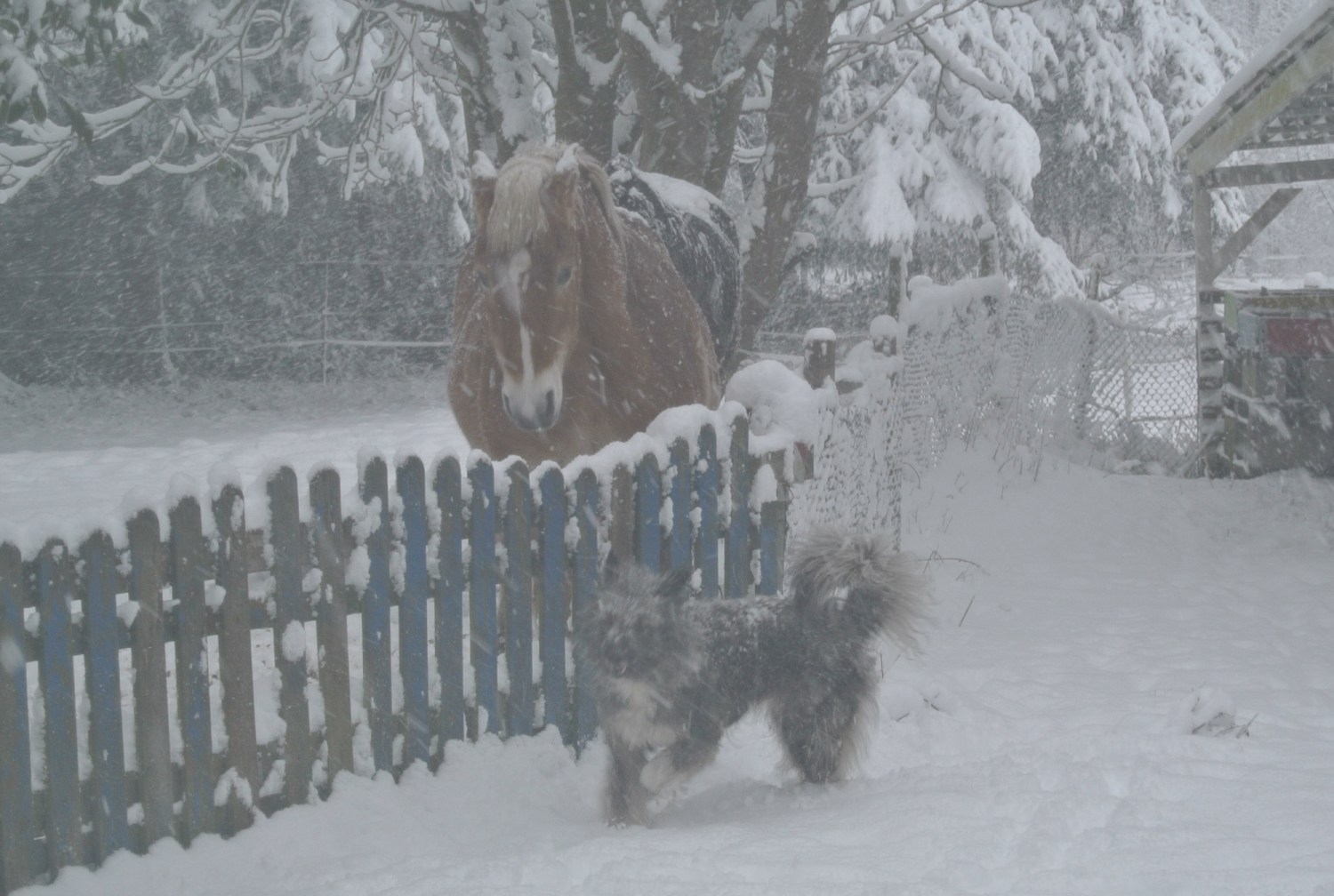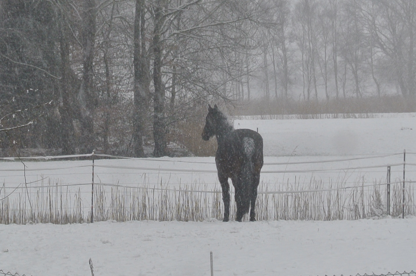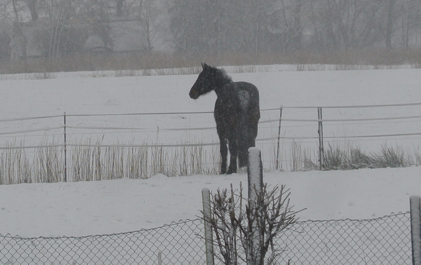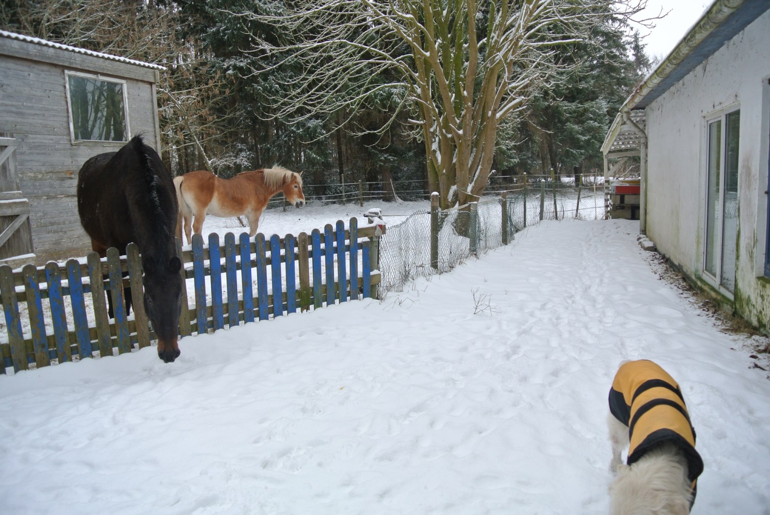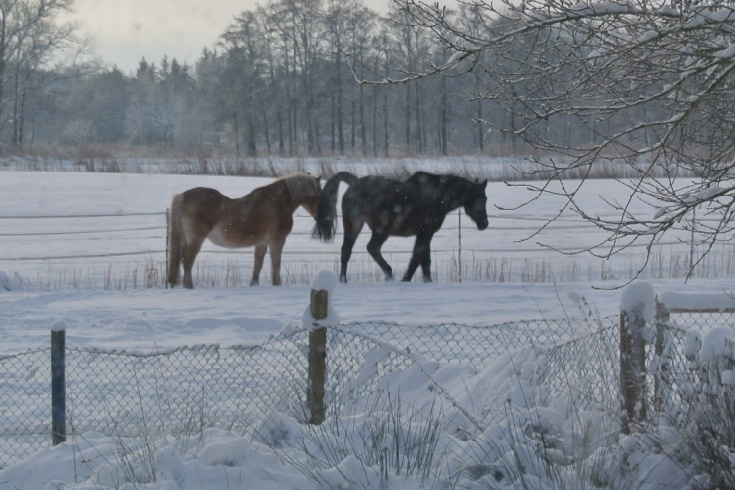 Ich habe noch ein paar Fotos von den Pferden und Hunden im Schnee für euch. Die Bilder sind am 04. Januar entstanden. Beim Schneesturm habe ich nicht fotografiert.