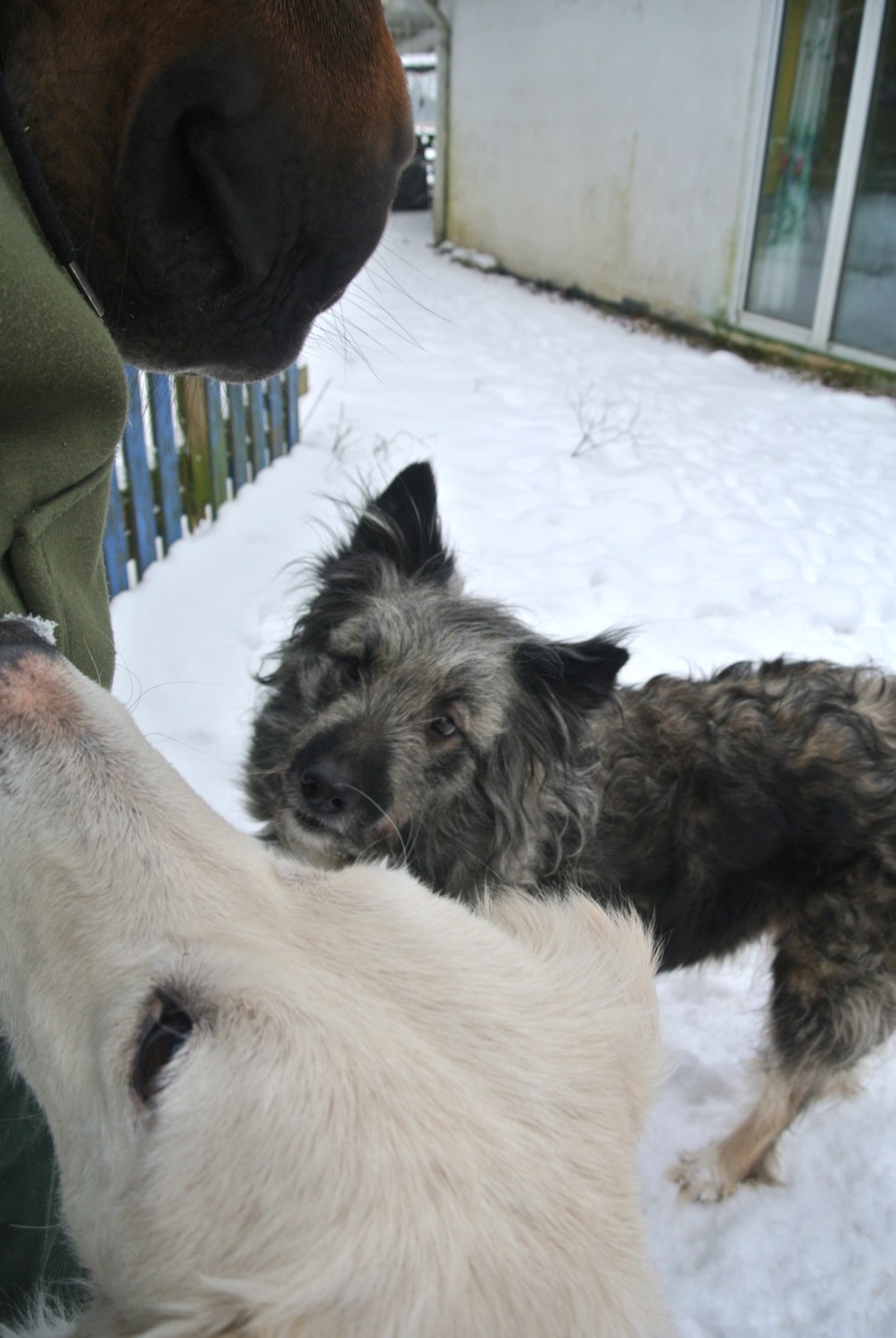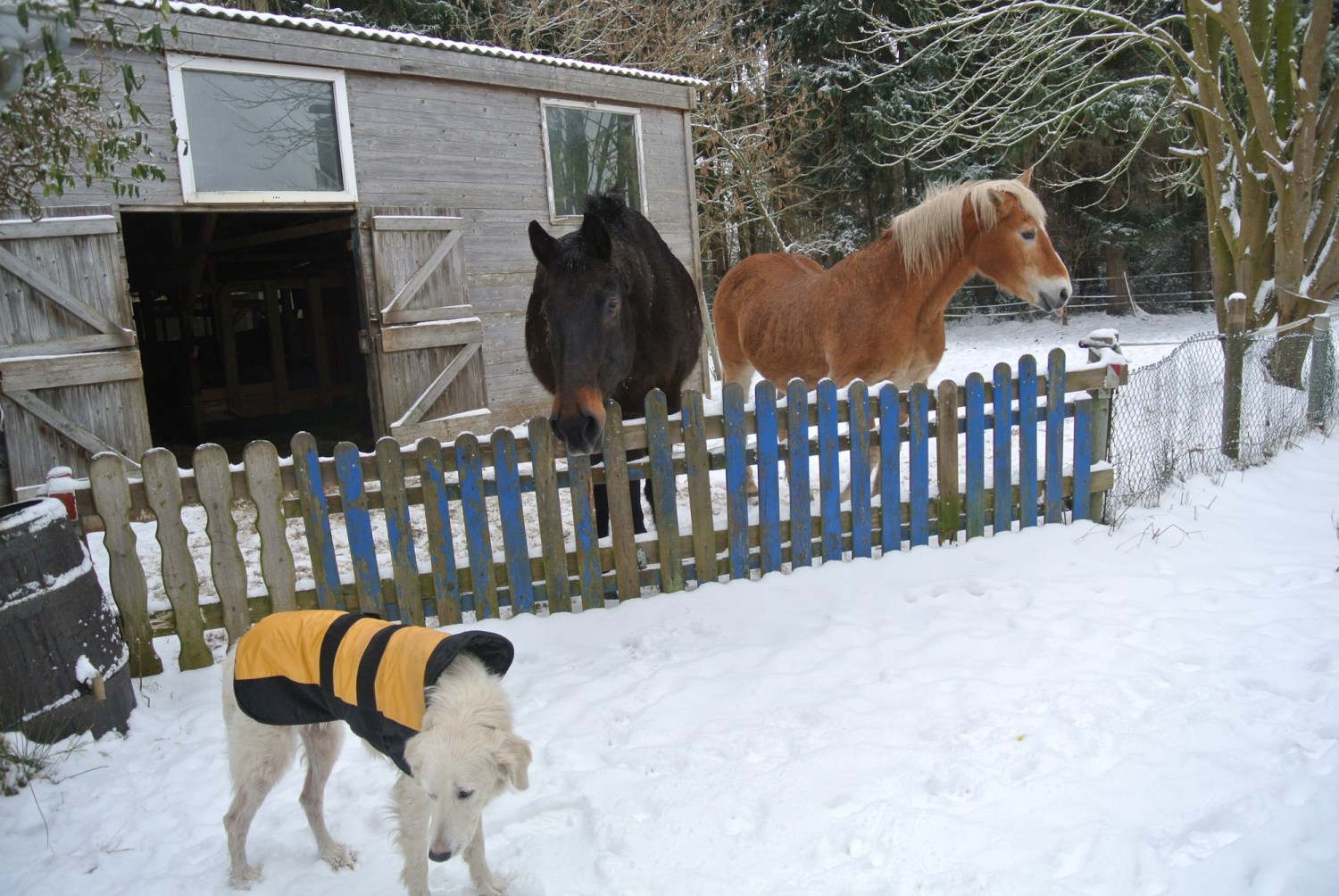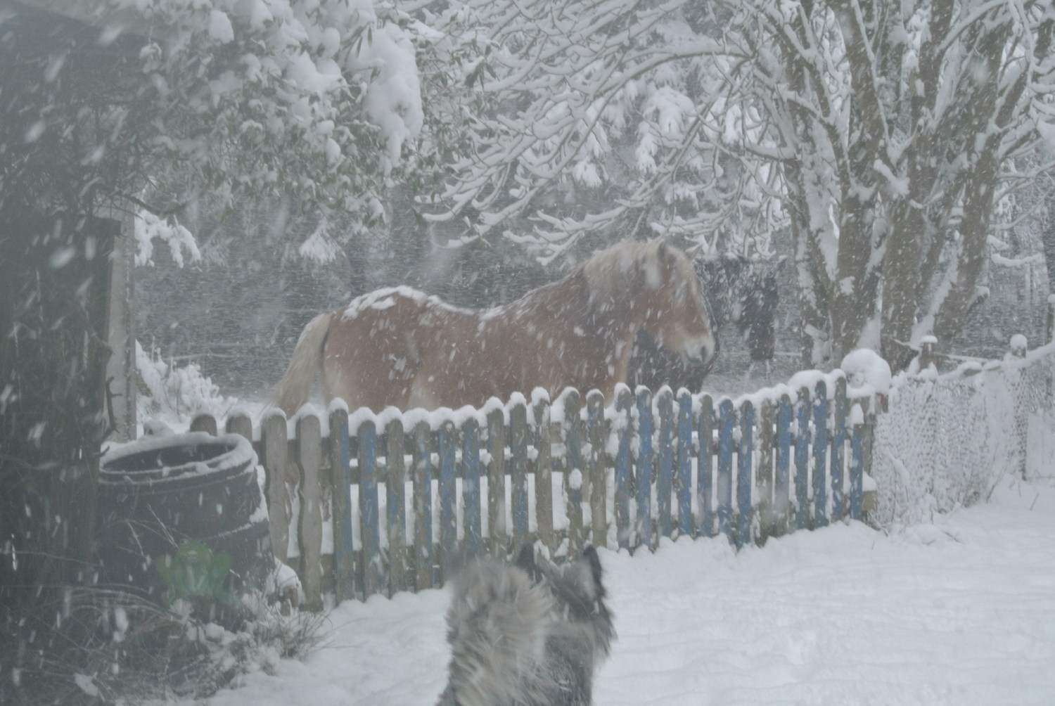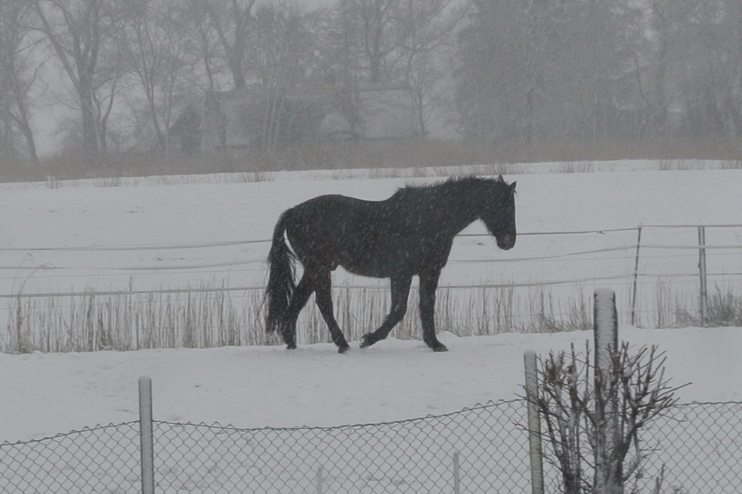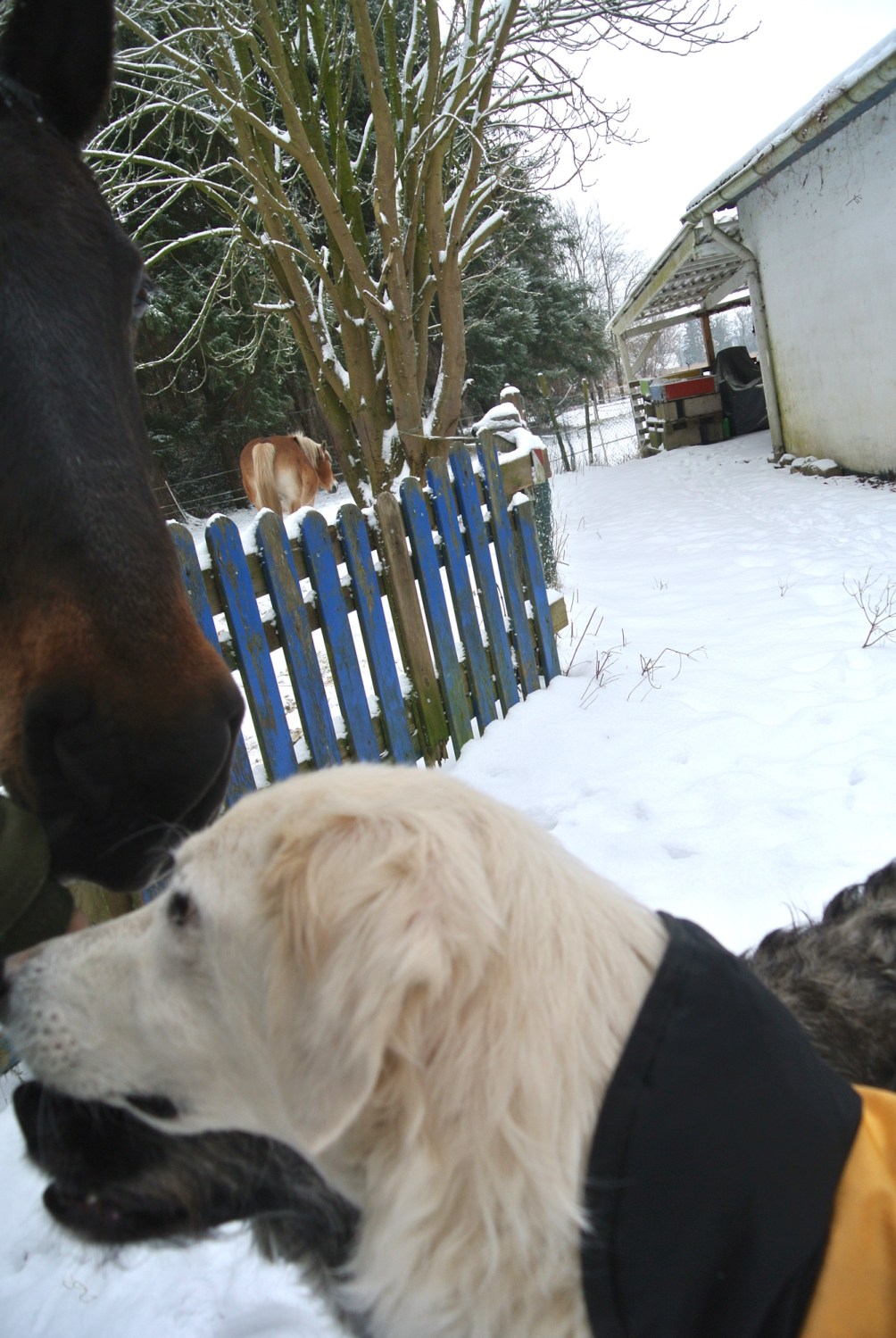 Ich habe noch ein paar Fotos von den Pferden und Hunden im Schnee für euch. Die Bilder sind am 04. Januar entstanden. Beim Schneesturm habe ich nicht fotografiert.