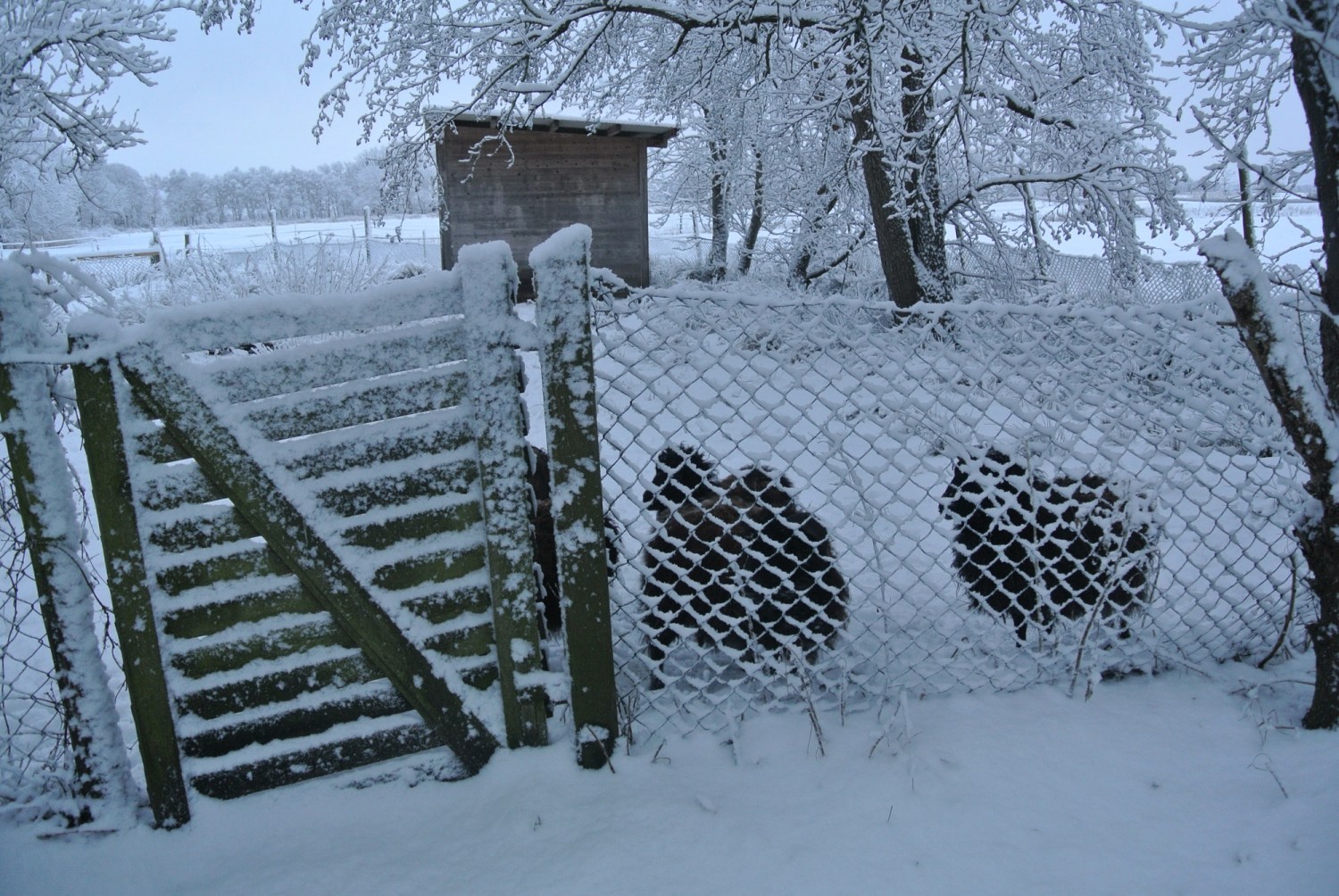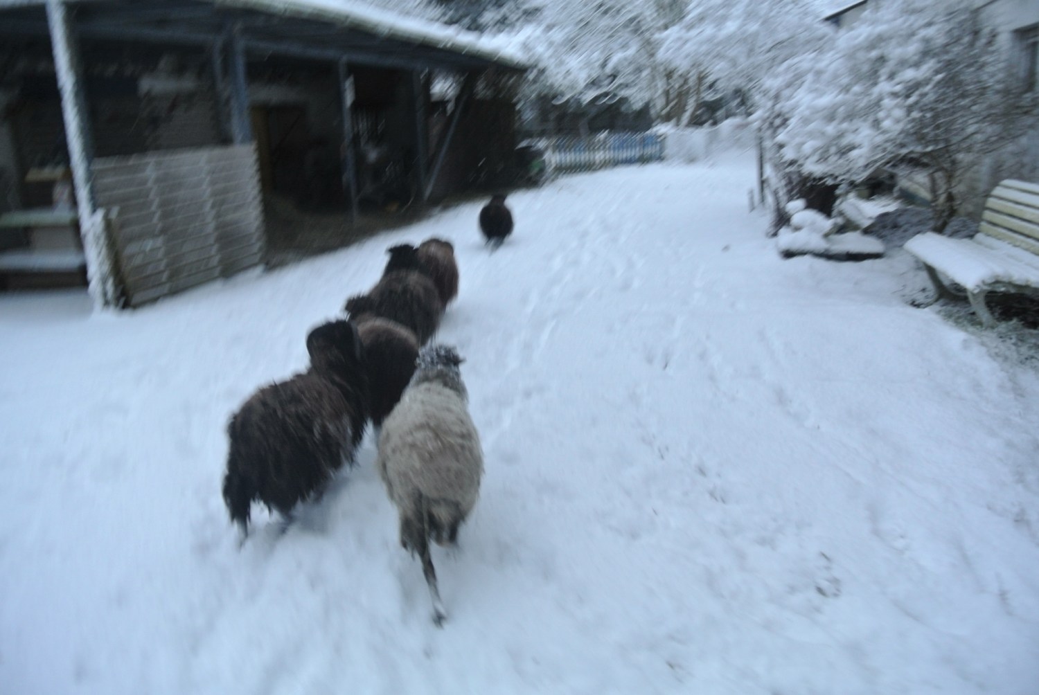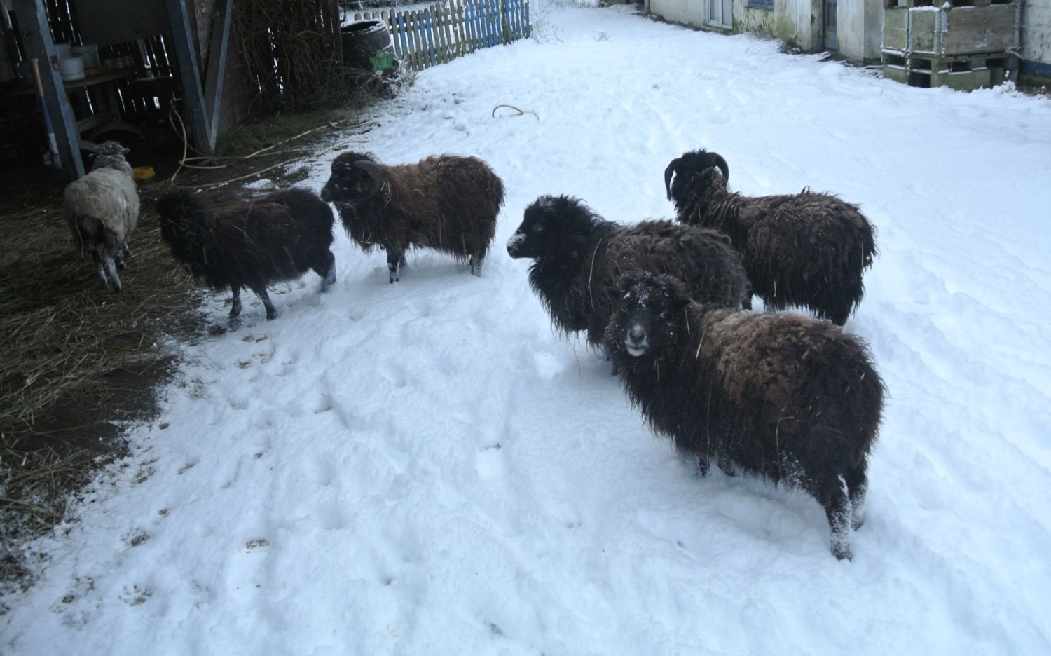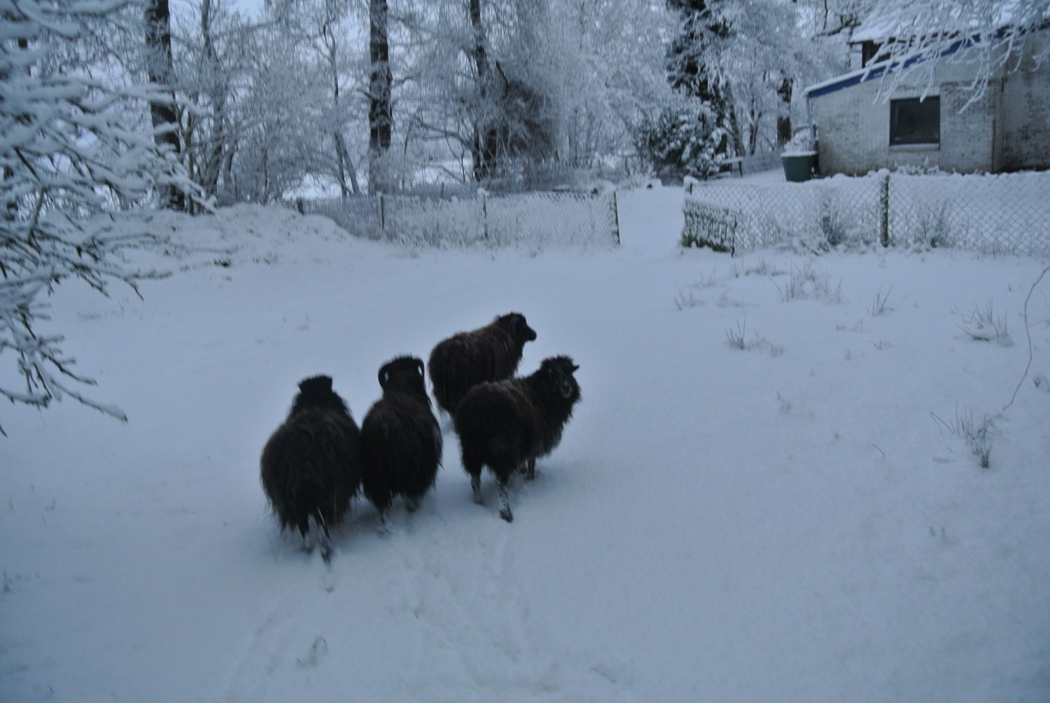 Ich habe noch ein paar Schneebilder für euch. Diesmal sind unsere Ouessantschafe zu sehen. Dank der dicken Wolle machen ihnen Schnee und Kälte nichts aus.