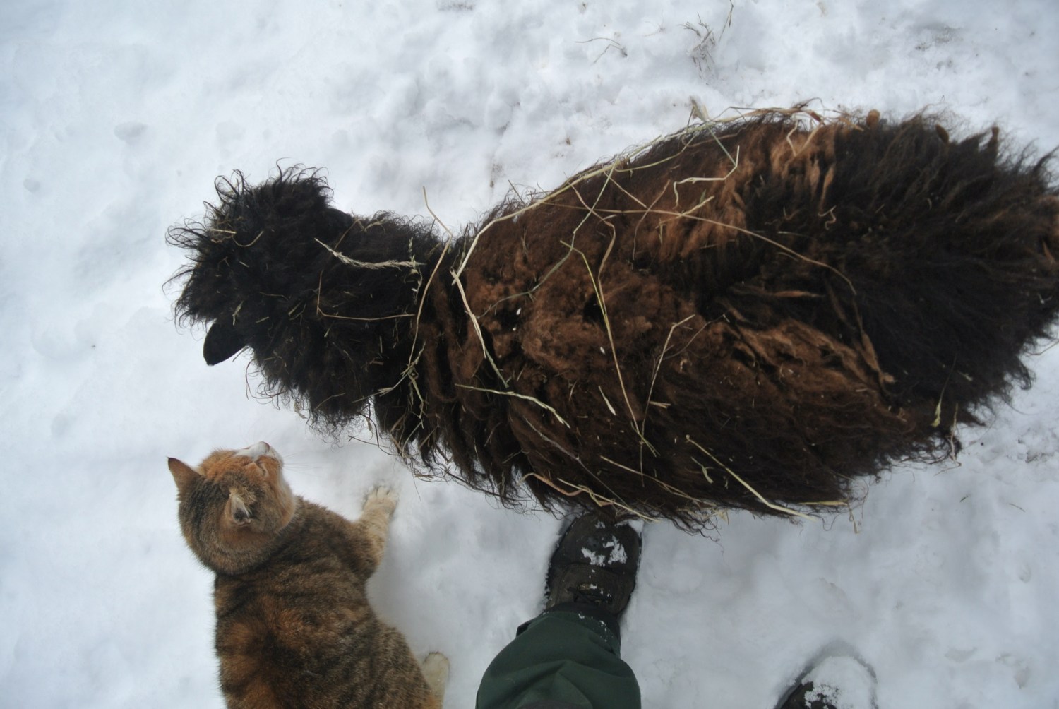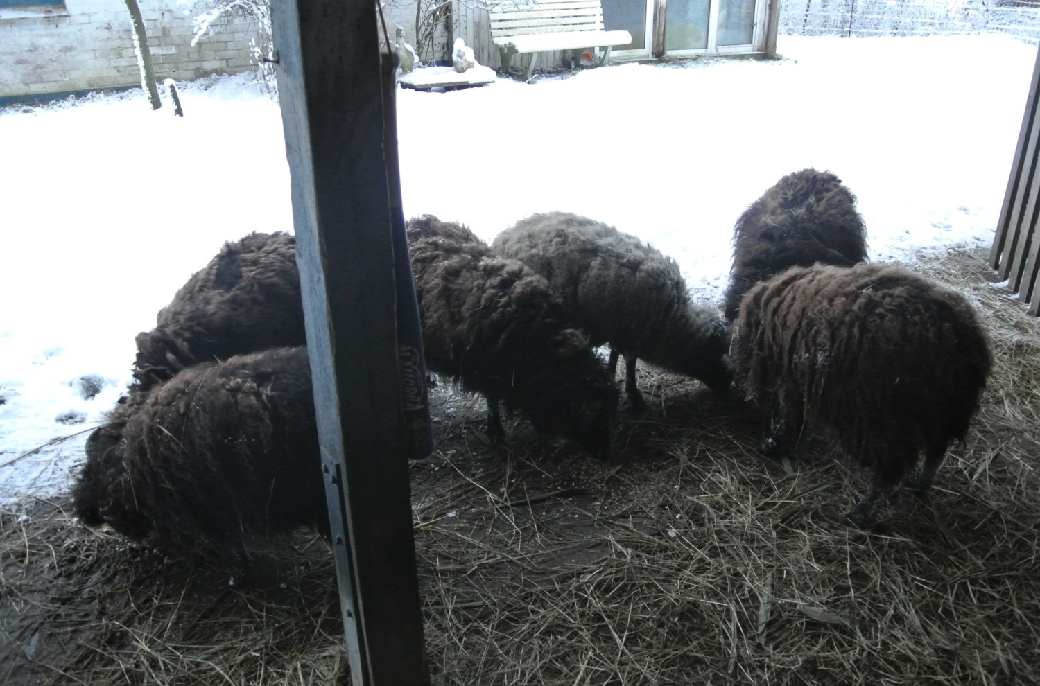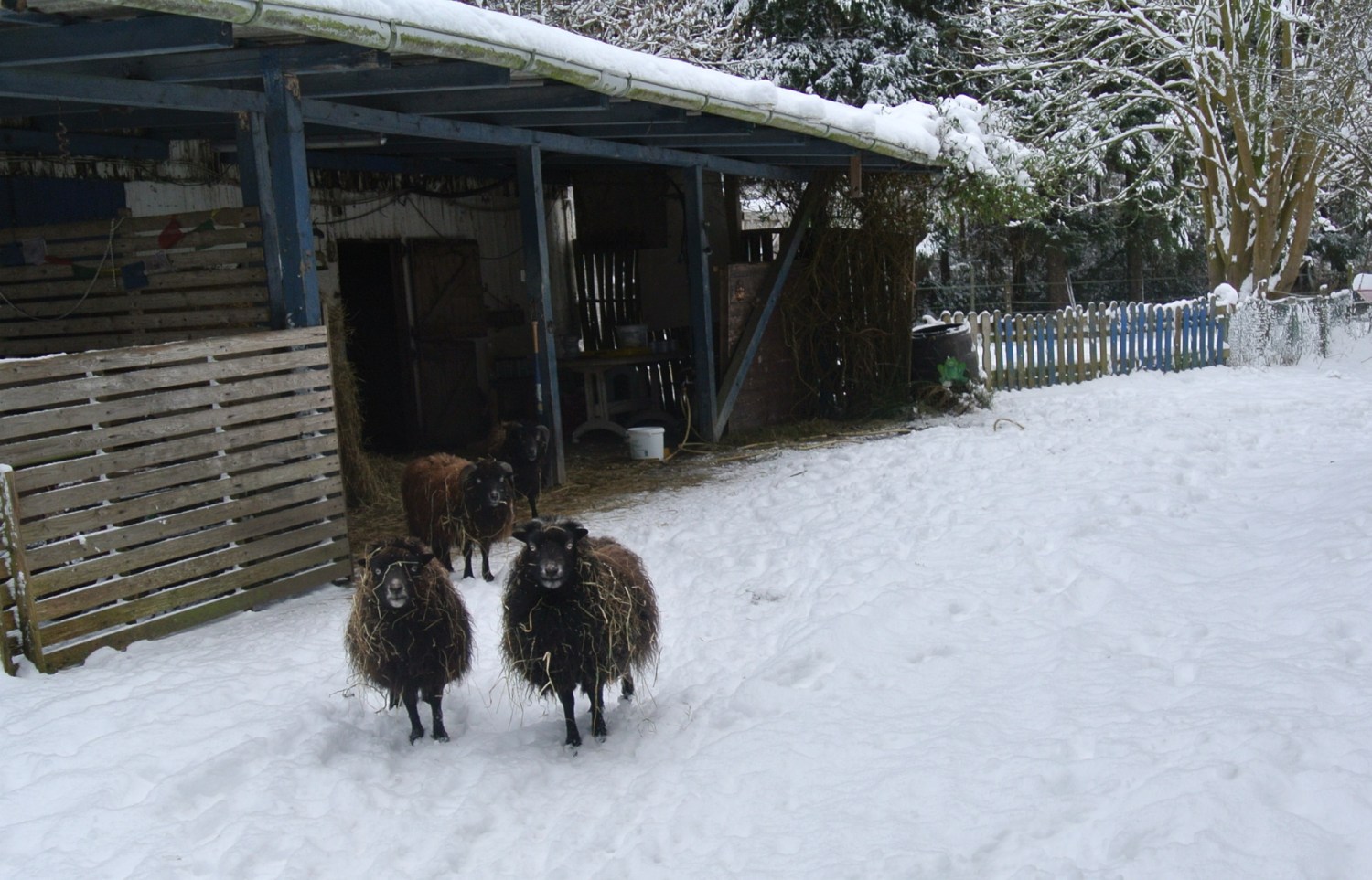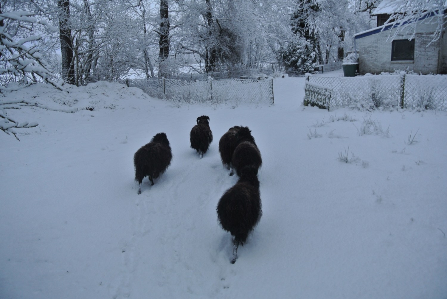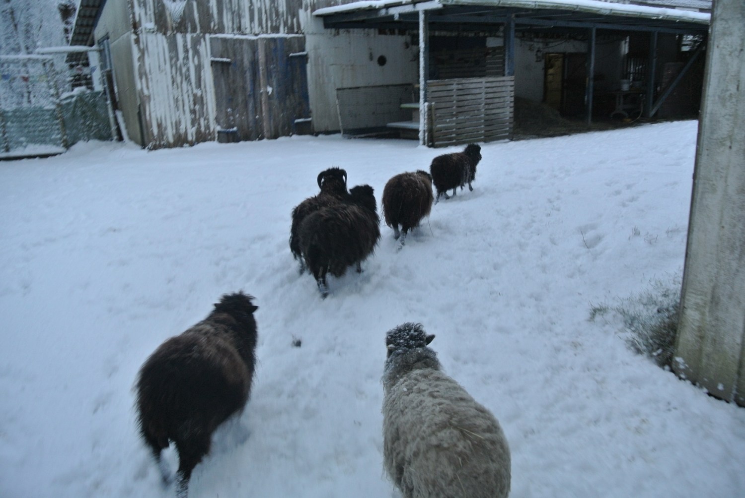 Ich habe noch ein paar Schneebilder für euch. Diesmal sind unsere Ouessantschafe zu sehen. Dank der dicken Wolle machen ihnen Schnee und Kälte nichts aus.