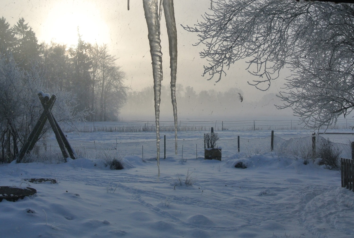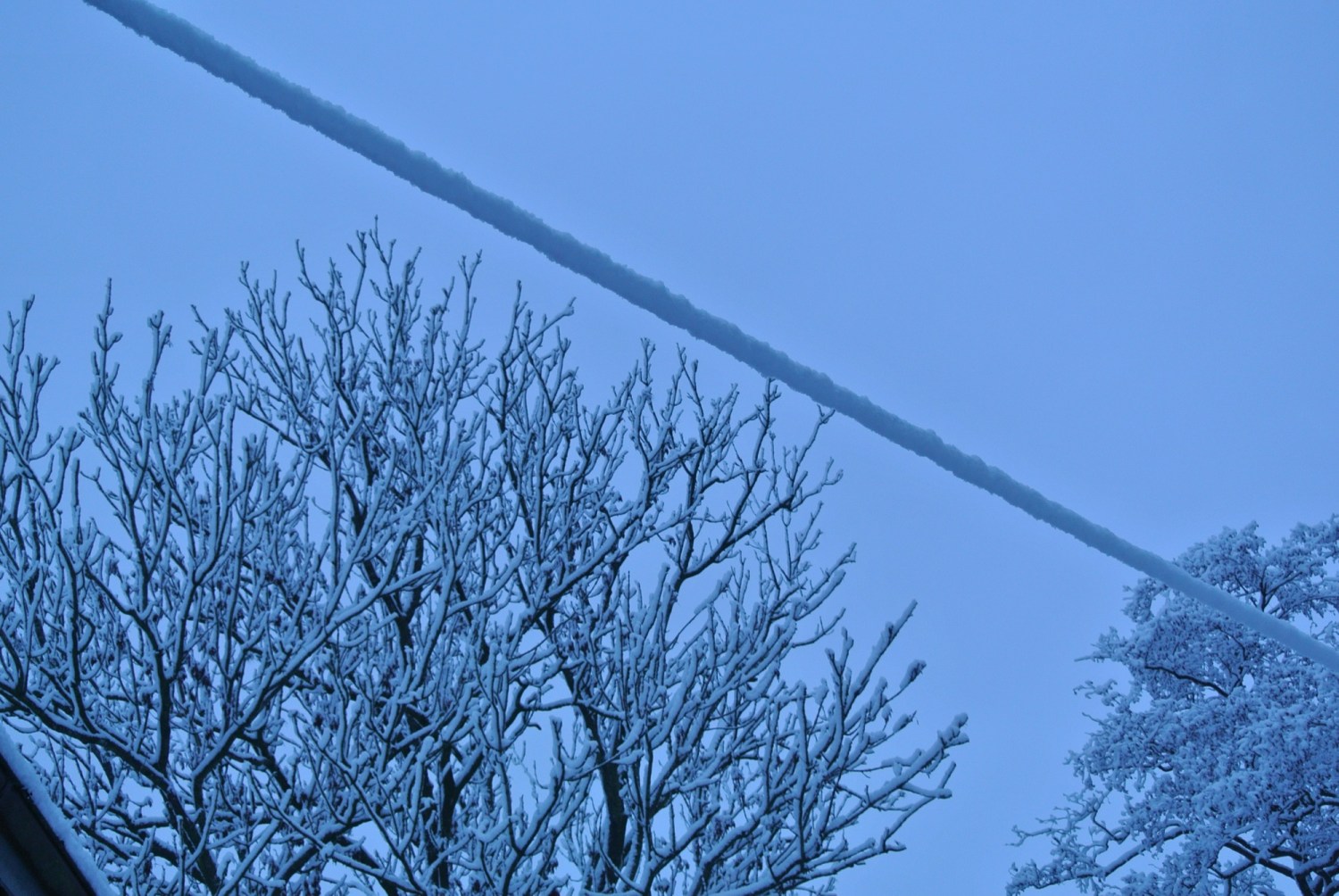 Das ist unsere Telefonleitung. Eigentlich nur ein dünnes Kabel aber durch den Schnee sieht sie wie eine dicke Starkstromleitung aus.