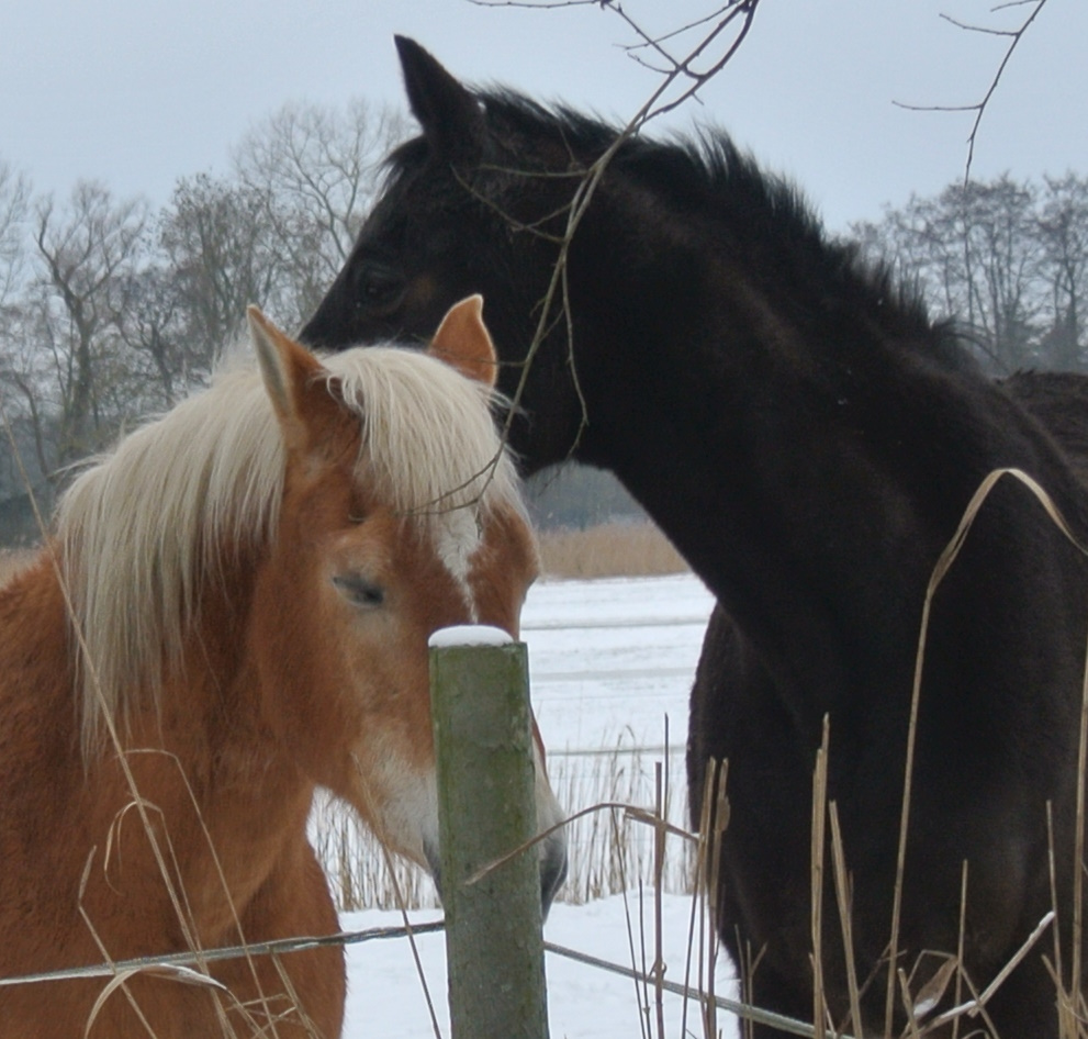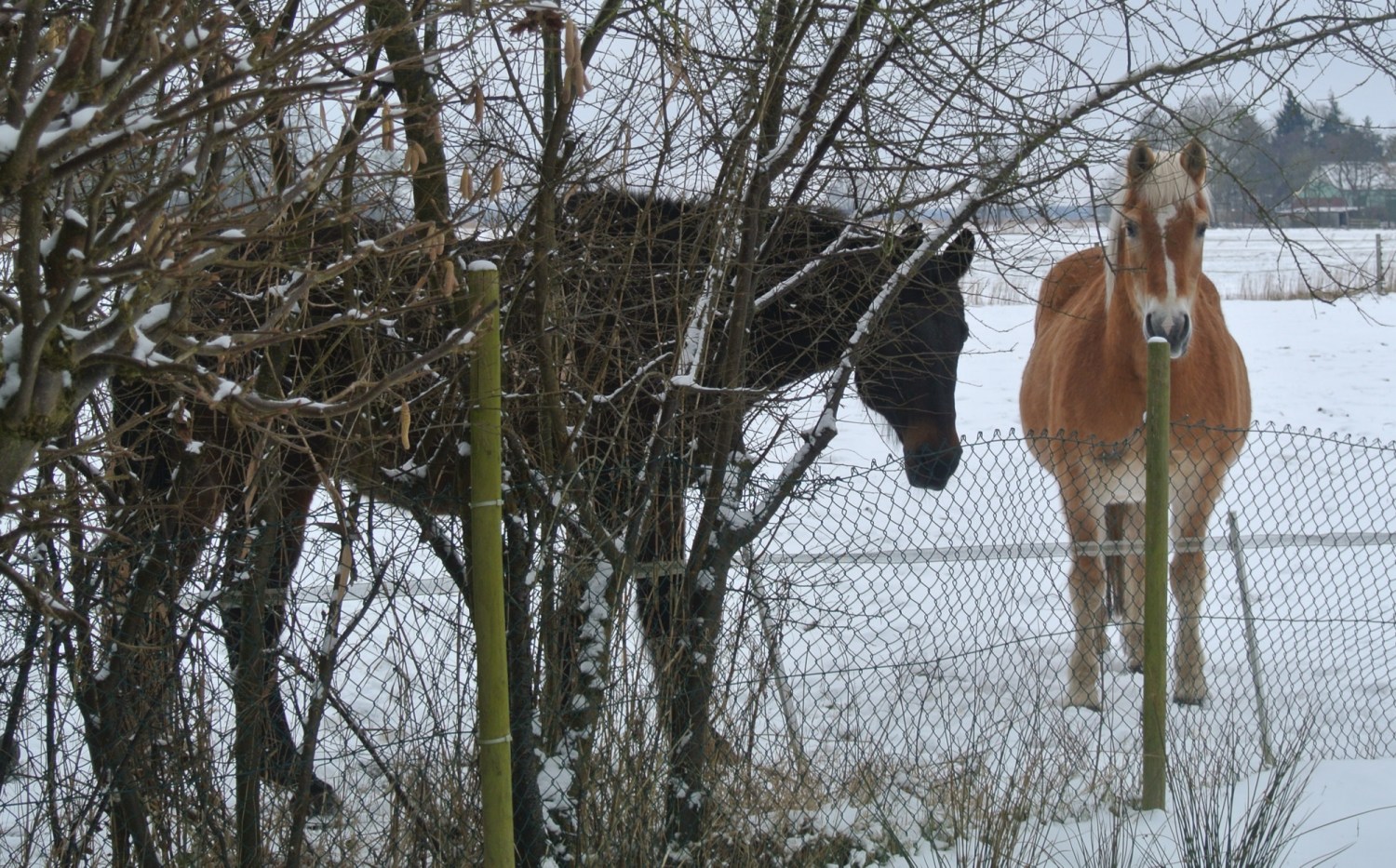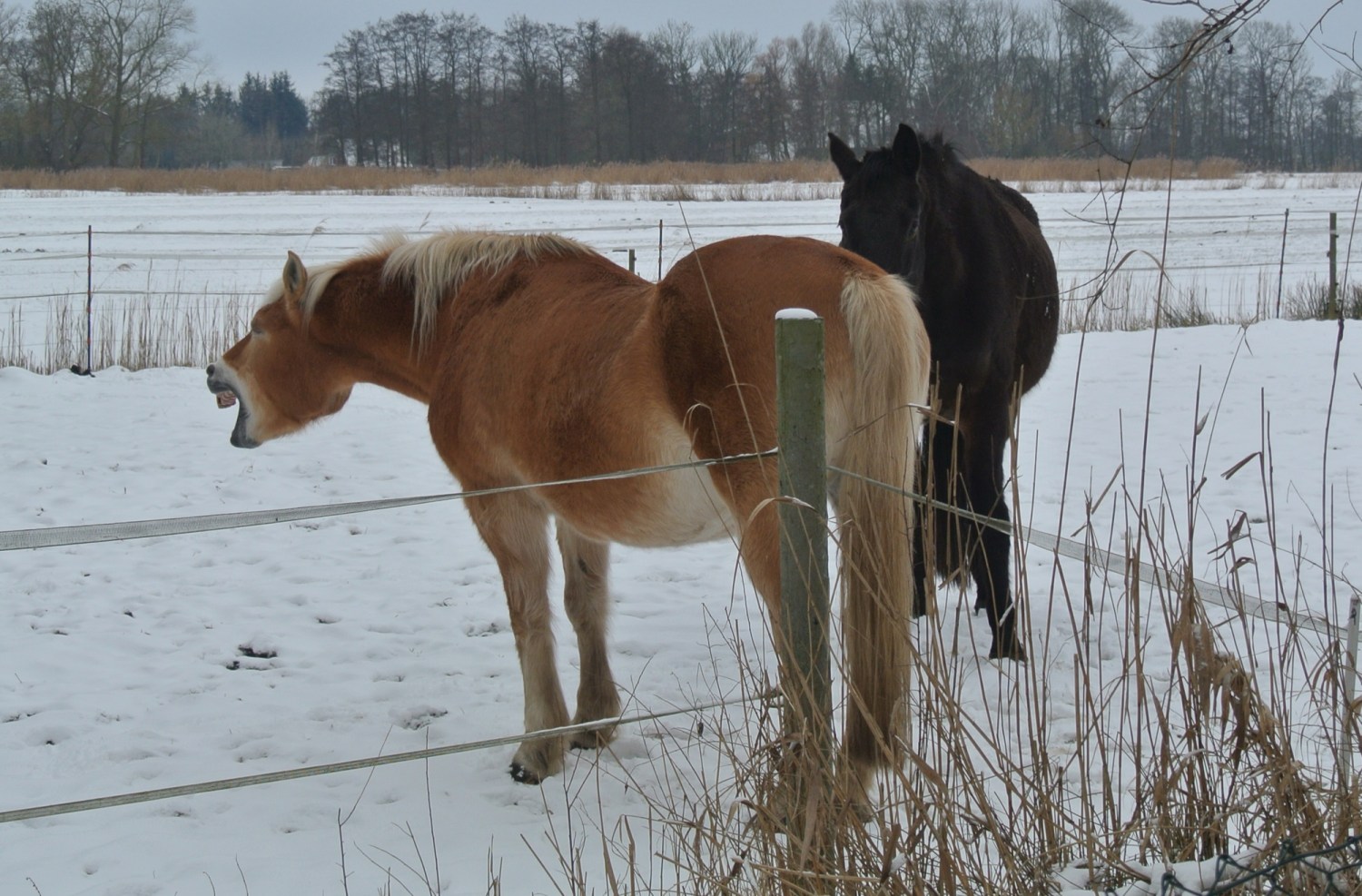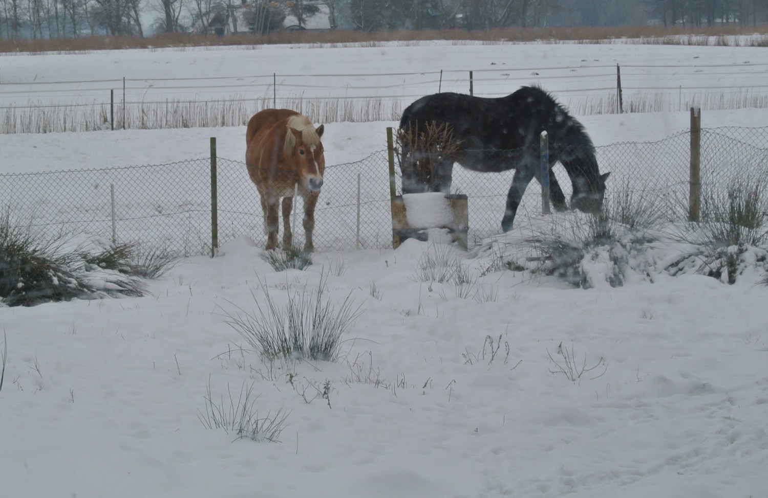Hier sieht man gut die isolierende Wirkung des Winterfells. Der Schnee bleibt auf den Pferden liegen.