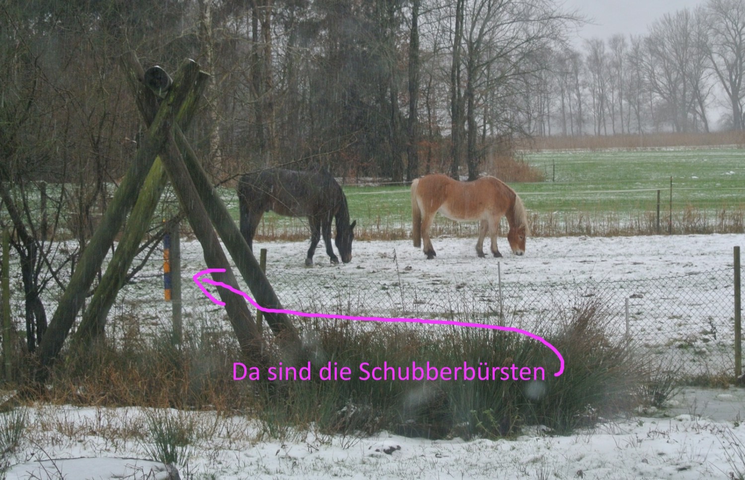 Wir hatten für Limerick aufgerüstet und Schubberbrüsten an einen, wie wir dachten, besonders stabilen Pfosten geschraubt. Die Bürsten ignorierte der Wallach aber gekonnt.