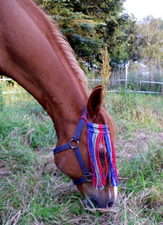Miranda kommt mit dem Fliegenschutz nicht klar. So was kennt sie nicht. Der Züchter hatte nie etwas gegen die Fliegen unternommen… Versuche gerade sie daran zu gewöhnen. Wenn wir so weit sind, bekommt sie natürlich einen Fliegenvertreiber in Pink, wie es sich für eine Prinzessin gehört! 😉