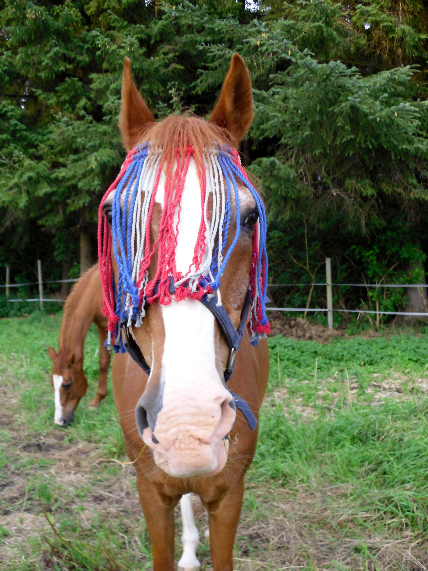 Wir meinen dazu: „Er hat eindeutig optisch gewonnen. Blau, Weiß, Rot steht ihm phantastisch und passt hervorragend zum Halfter. Mit dem tollen Fliegenschutz braucht er sich wirklich nicht zu verstecken!“