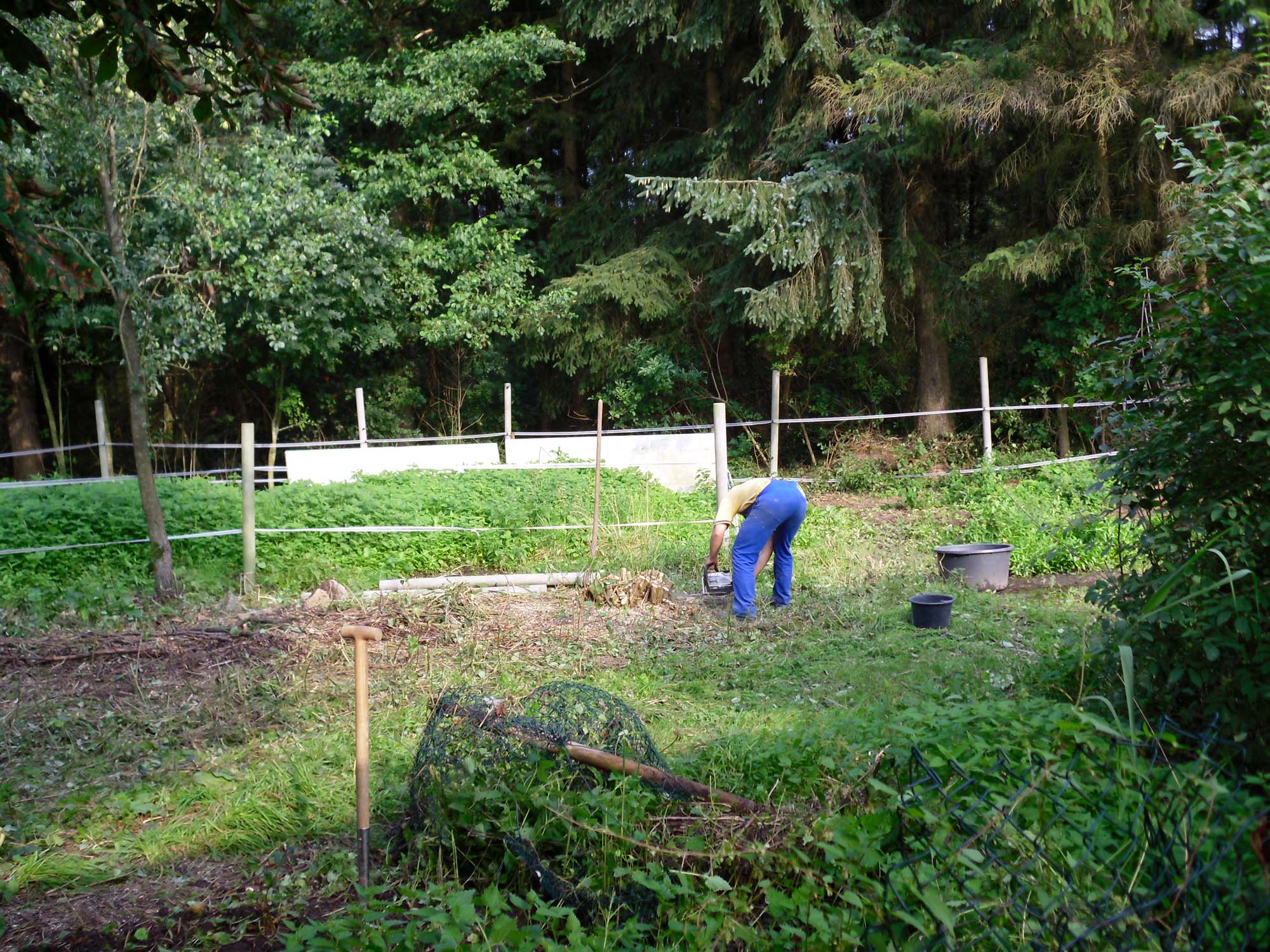 Martin sägte mit der Kettensäge alle Bäume und Sträucher, die den Weg versperrten. Ich schleppte alles in den Wald. Wir mussten den Zaun neu ziehen, das Weidetor umsetzen und anschließend noch aufräumen.
