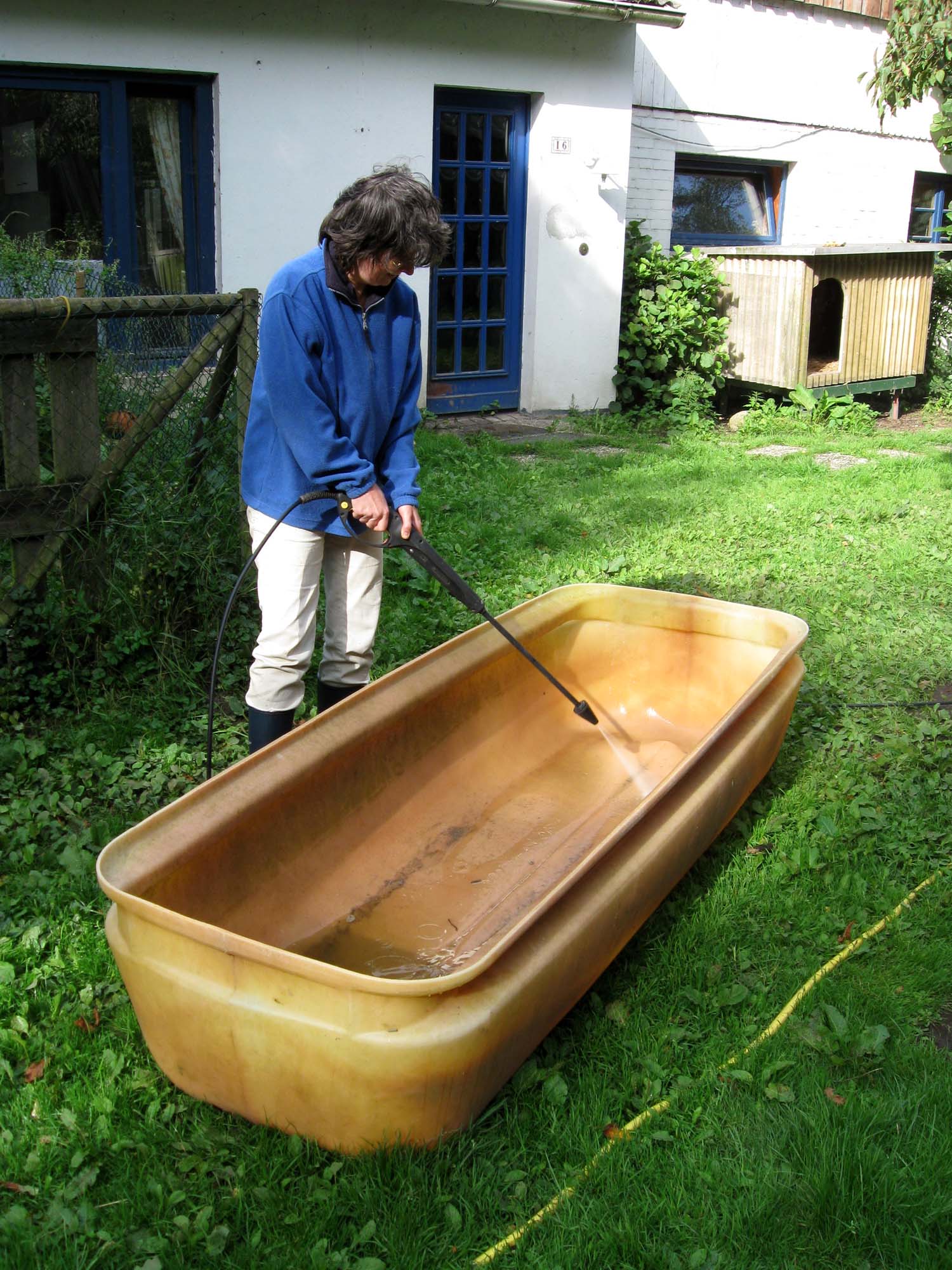 Heute war der freiwillige Helfer Gerd bei uns. Er half mir den Wassertrog für die Pferde zu verschönern. Das Teil besteht aus orangefarbenem Kunststoff und ist größer als eine Badewanne. Es steht auf dem hinteren Teil der Weide und dort stand es schon, als ich herzog. Leider hatte der sonst so wunderbar stabile Behälter, im oberen Rand zwei unschöne Risse, die mir zu scharfkantig und damit gefährlich für die Pferde waren. Das konnte so nicht bleiben und sollte heute mit Gerds Hilfe geändert werden.