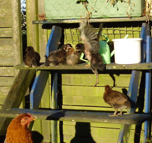 Langsam werden sie immer mutiger, entfernen sich schon weiter von der Mutter. Die Federchen wachsen an den Flügeln und diese werden auch schon eifrig benutzt. Wenn es mal zu Fuß nicht schnell genug geht, fliegen die kleinen ca. 30 cm über den Boden. Besonders wenn ich mit dem Futterteller komme. Das sieht so putzig aus! Gut 5 Kg Kükenkorn haben die Kleinen schon verputzt! Kein Wunder, dass die so schnell wachsen! 😉