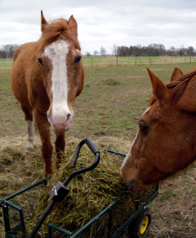 Als ich das 3. Mal mit dem Bollerwagen auftauchte, wussten die Pferde ganz genau: „Da kommt unser Essen auf Rädern“! Eben so wie es sich für Rentner gehört! 😉