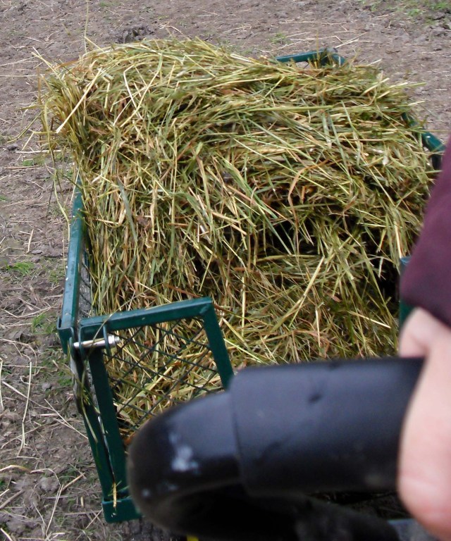 Weil 2 Stunden in Wasser eingeweichtes Heu ziemlich schwer ist, habe ich mir für den Transport zur Weide etwas einfallen lassen. Ich nehme jetzt meinen grünen Bollerwagen, der ganz aus Metallgittern gefertigt ist. Da kann so schön das überschüssige Wasser ablaufen und ich muss nicht mehr so viel schleppen. Außerdem werde ich nicht immer so patschnass.