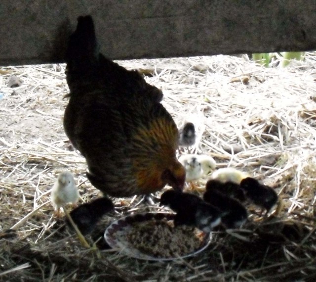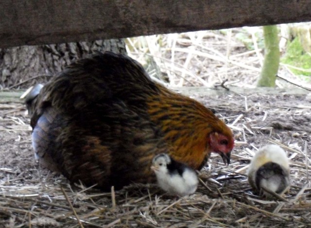 Bilder von gestern, später nachmittag. Hier sind sie gerade einen Tag alt. Zwei ganz neugierige wuseln um die Mutti rum. Die anderen sitzen schon wieder unter der Glucke und lassen sich wärmen. Die Küken haben ja immer ihre Wärmflasche dabei. Wenn es ihnen kalt wird piepsen sie und schon lässt Mutti sie unter schlüpfen.