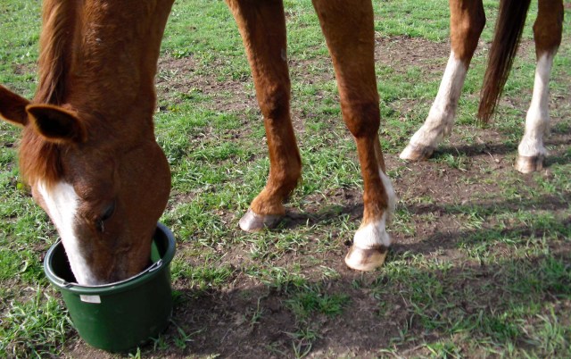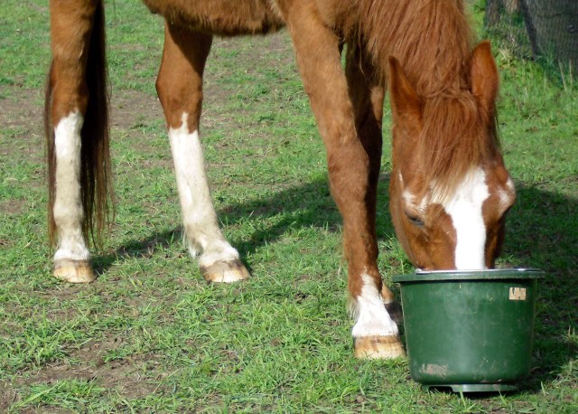 Nach der Pediküre gabs noch die Frühjahrs-Wurmkur. Das trifft nicht unbedingt auf wahre Begeisterung bei den beiden Pferden. Zu schmecken scheint es nicht besonders gut. Sie schlucken das Zeug aber trotzdem brav. Da ist der Eimer mit Müsli eine schöne Wiedergutmachung.