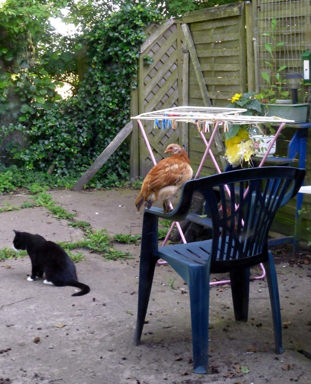 In deinem Außenbereich gibt es ja sowieso keine hühnerfreie Zone, dann kann sich das Großküken/Kleinhuhn auch mal einen Stuhl gönnen. Achte beim Doch-Mal-Hinsetzen auf Hinterlassenschaften der Halbwüchsigen…… 😉
