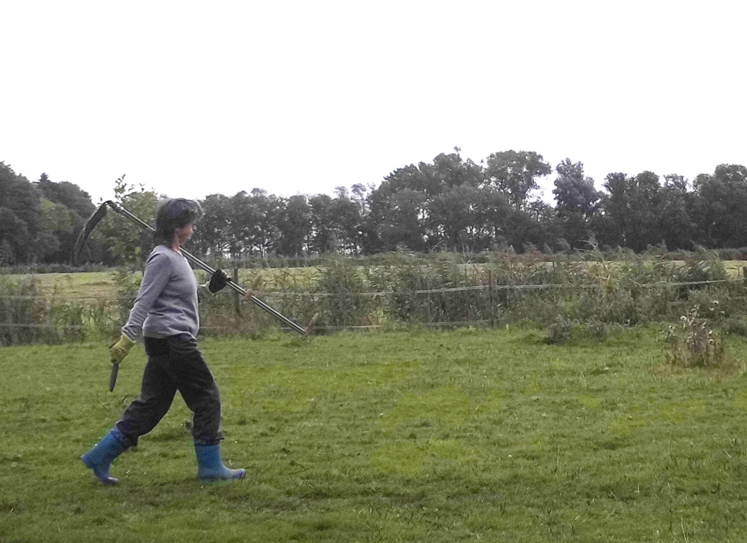 Zu meinen Aufgaben auf dem Hof gehört unter anderem, regelmäßig den Weidezaun mit der Sense vom Grünzeug zu befreien. Bei zu starkem Bewuchs, ist nicht mehr genug Strom auf der Litze. Entlang der Gräben wächst bei uns Schilfgras, was sehr hoch wird.