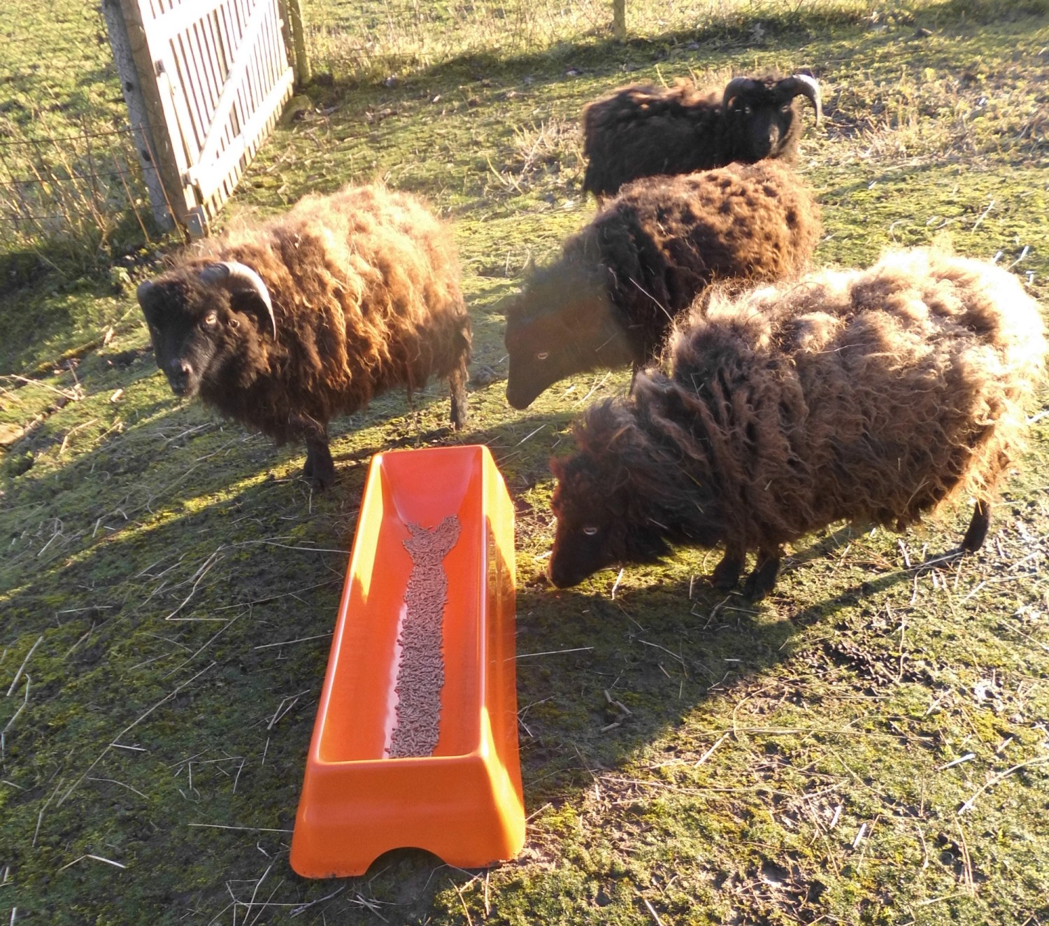 Hier sieht ihr den neuen Futtertrog im Einsatz. Die Schafe freuen sich sehr über das tolle Teil. Eigentlich steht er im Stall, für die Fotos habe ich ihn rausgestellt.