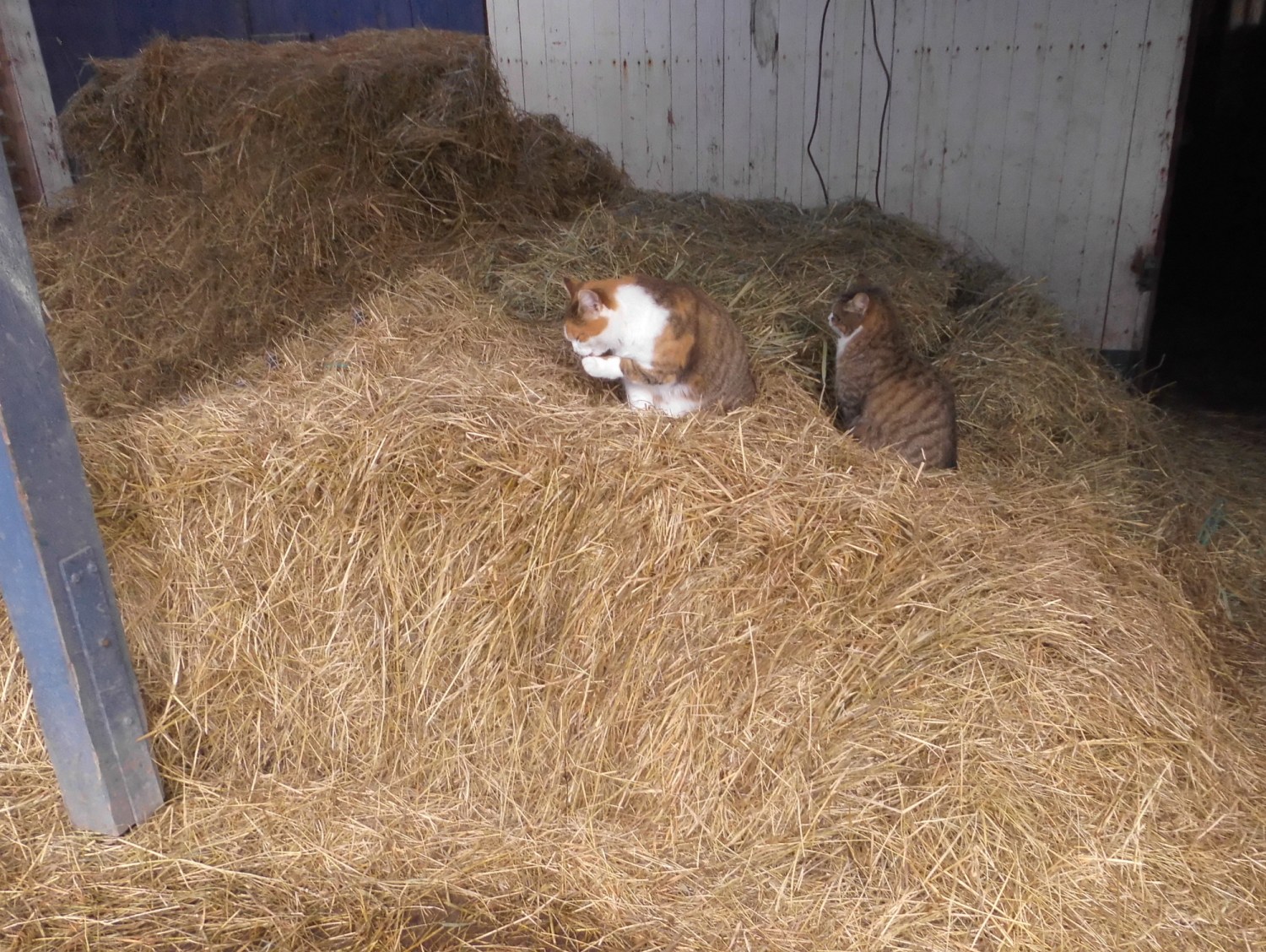 Natürlich hocken gleich wieder ein paar Katzenviecher im Heu.