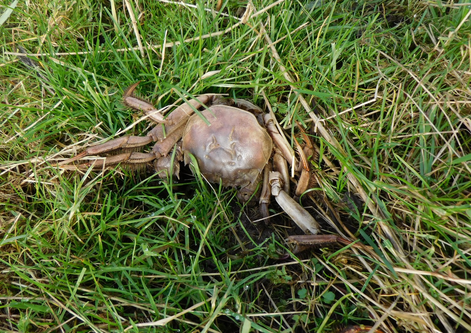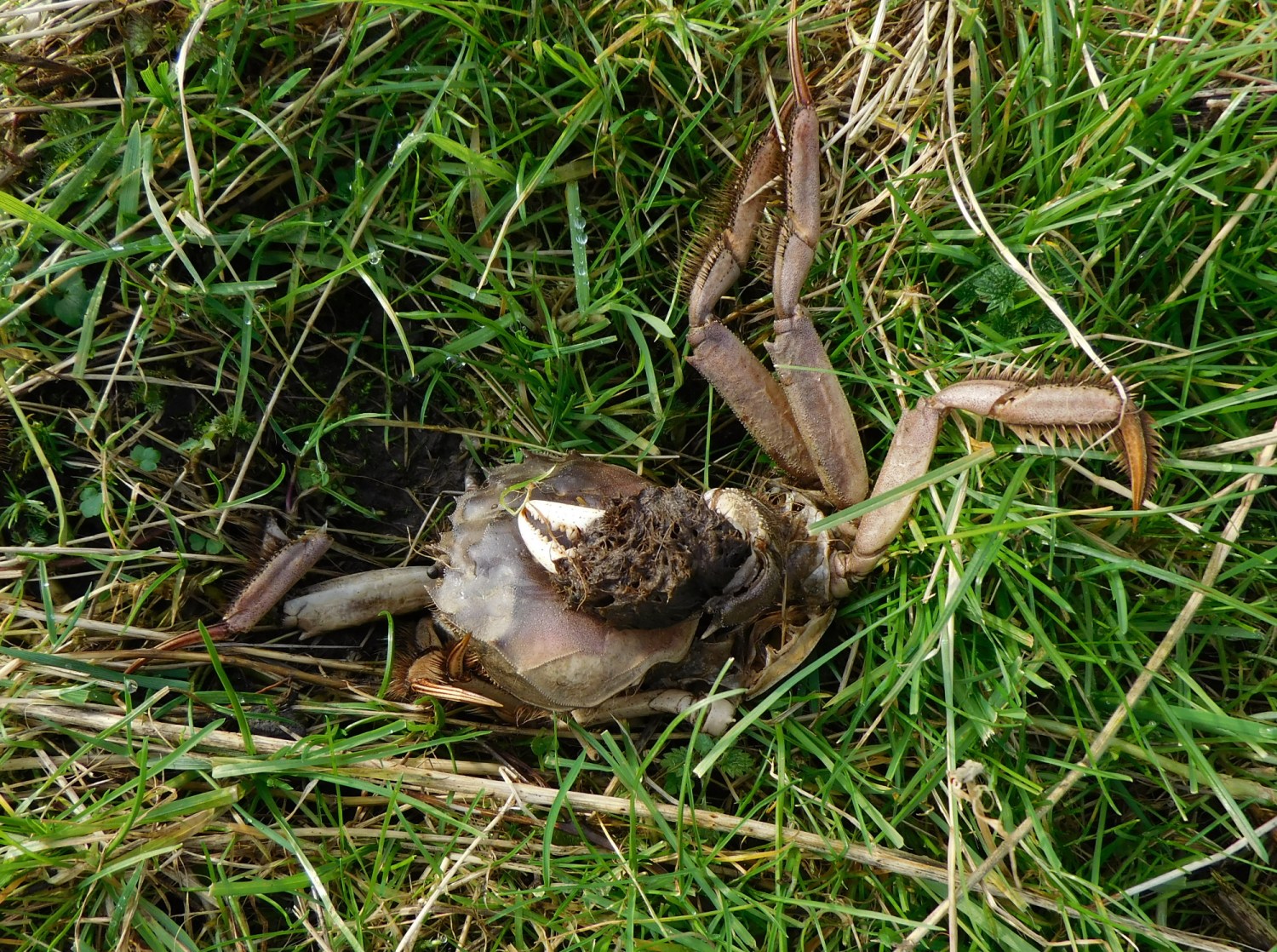 Ich habe dieses Tier heute Morgen auf der Pferdeweide gefunden. Leider ist eines der Pferde draufgetreten. Die Krabbe hat das nicht überlebt. Es waren einige Beine abgebrochen und der obere Panzer lag nur noch lose auf.