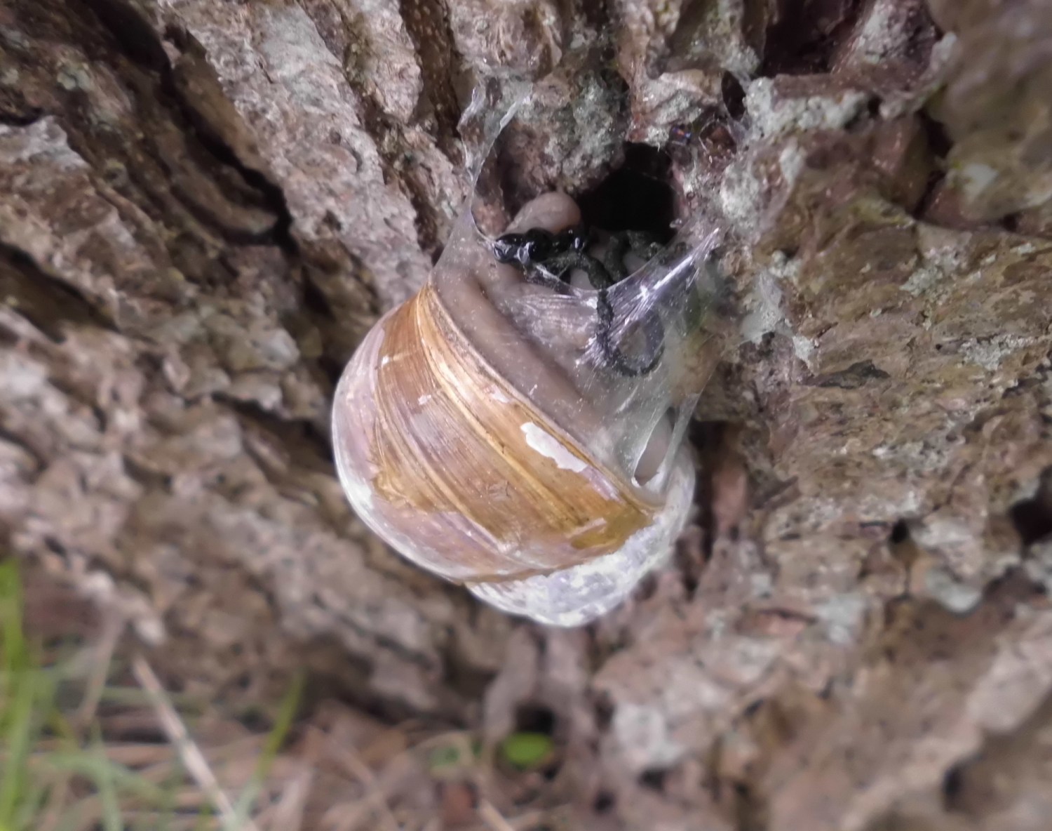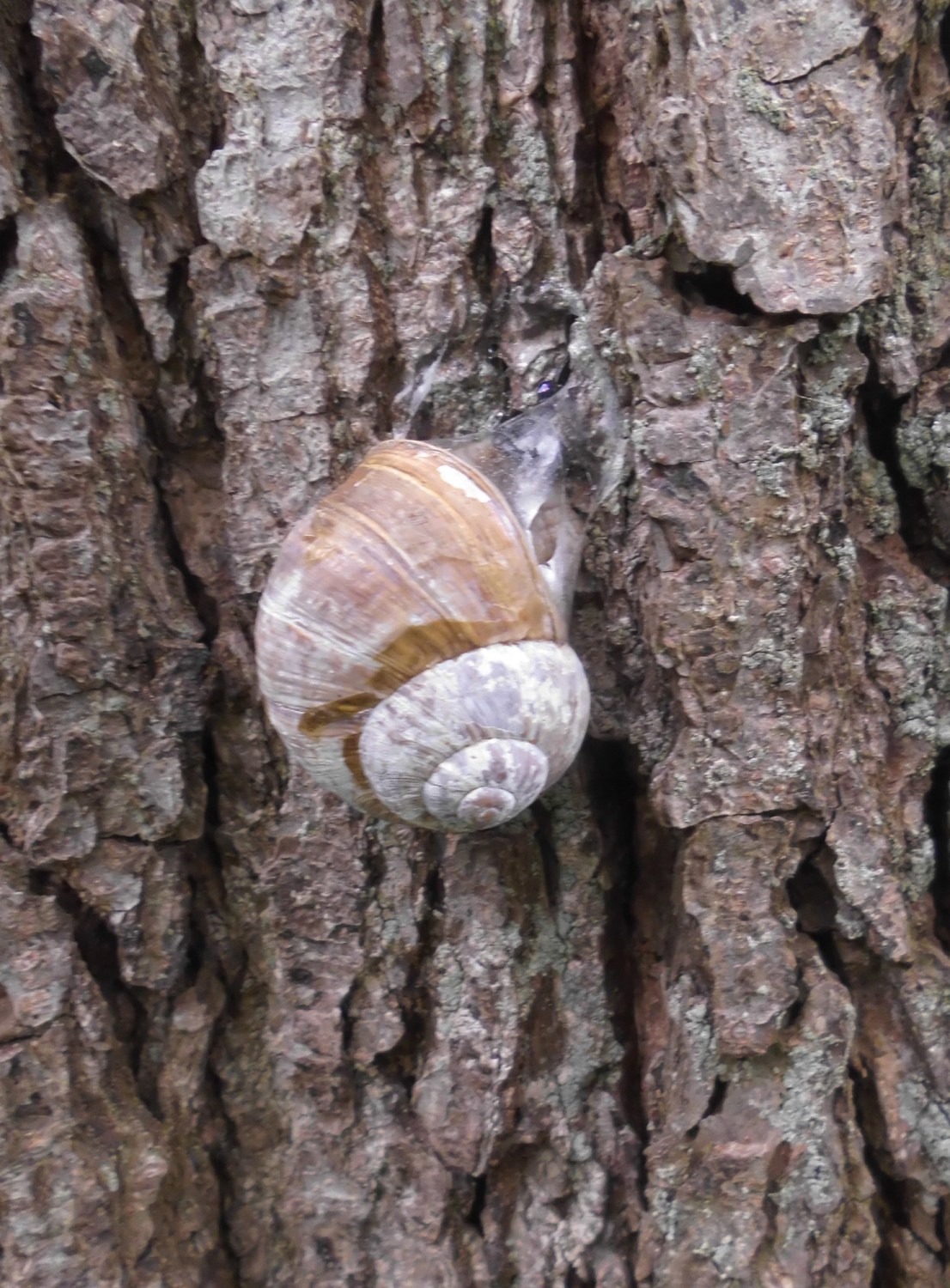 Am ersten Tag verließ sie noch ihr Haus und bewegte sich am Baumstamm. Die ist ganz schön groß! Als ich am nächsten Tag nach ihr schaute, war es der Schnecke wohl zu kalt geworden.