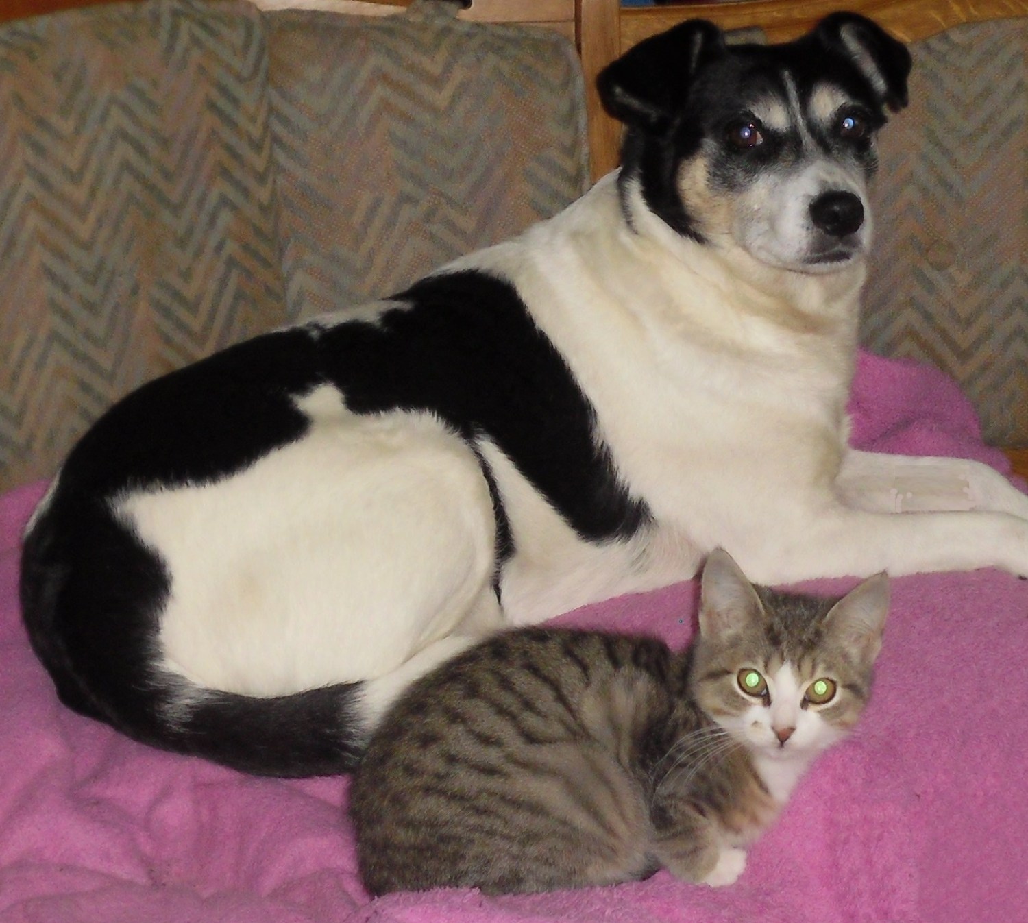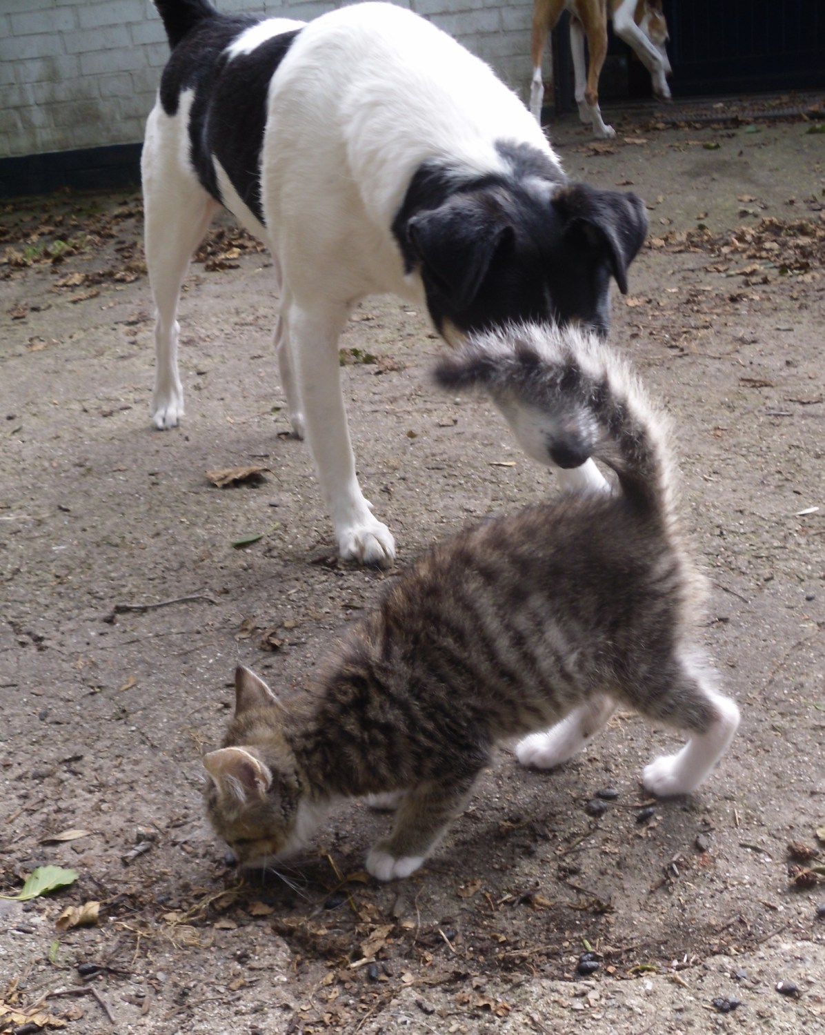 Campa ist ein spanischer Terrier. Der Ratonero Bodeguero Andaluz wurde gezüchtet um spanische Weinkeller Mäuse- und Rattenfrei zu halten. Als Campa zu uns kam wollte sie jedes Kleintier töten und Katzen hatte sie zum Fressen gern. Ich habe ihr das Töten erst abgewöhnt. Seitdem ist sie mit den Katzen gut Freund. Man kann einen erwachsenen Hund auch umerziehen. Das ist nur manchmal mühsam.