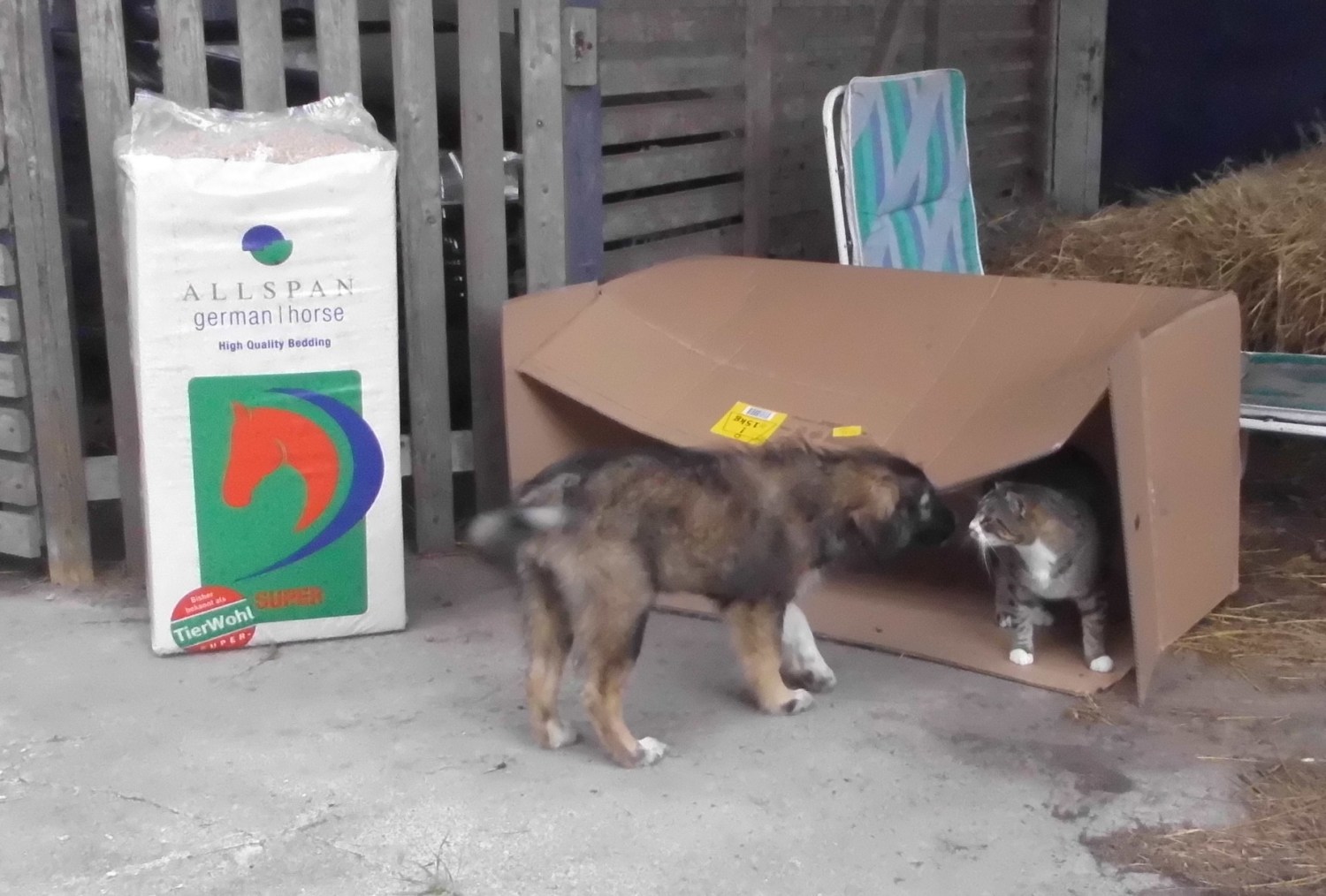 Der große Pappkarton ist ein schöner Spielplatz für die Miezen und einem kleinen Hündchen…