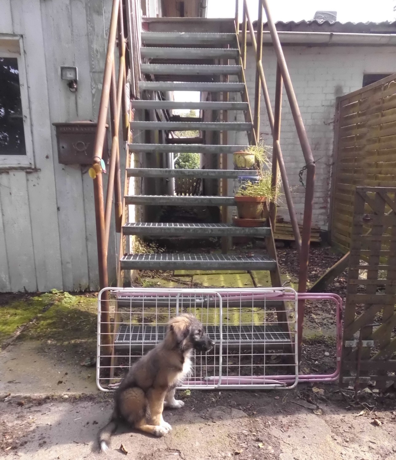 Im Gegenteil, sie muss jeden Winkel erkunden. Dabei ist sie doch tatsächlich die Eisentreppe hochgeklettert. Das hat noch kein Hund versucht. Die Katzen gehen gerne die Treppe hoch und das hat Marcy gesehen und nachgemacht.