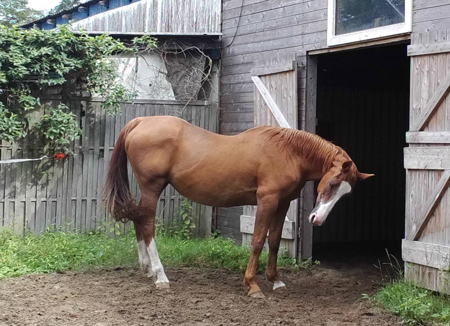 Nach gut 10 Minuten fuhr der Tierarzt auf den Hof. Ich führte ihn in den Stall und zeigte ihm die Stute. Da rief er plötzlich: „Oh der Dicke ist gerade rausgegangen!“ Der Tierarzt hatte nämlich die Stalltür offen gelassen… Nielsson der die Gelegenheit genutzt hatte, war mittlerweile im Innenhof angekommen.