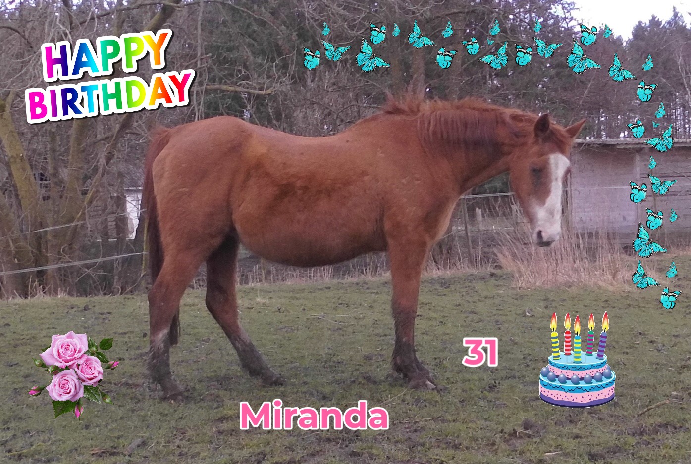 Wir helfen Miranda, einer ausrangierten Hannoveraner Zuchtstute. Wir sind eine kleine Gruppe Privatpersonen, die sich durch den Fall Miranda kennen lernten und eine Hilfsaktion daraus machten! Daraus ist 2015 der gemeinnützige Tierschutzverein "Tierhilfe Miranda e.V." geworden. Miranda bekam Freunde dazu und nun kümmern wir uns ausschließlich um alte und unvermittelbare Tiere.