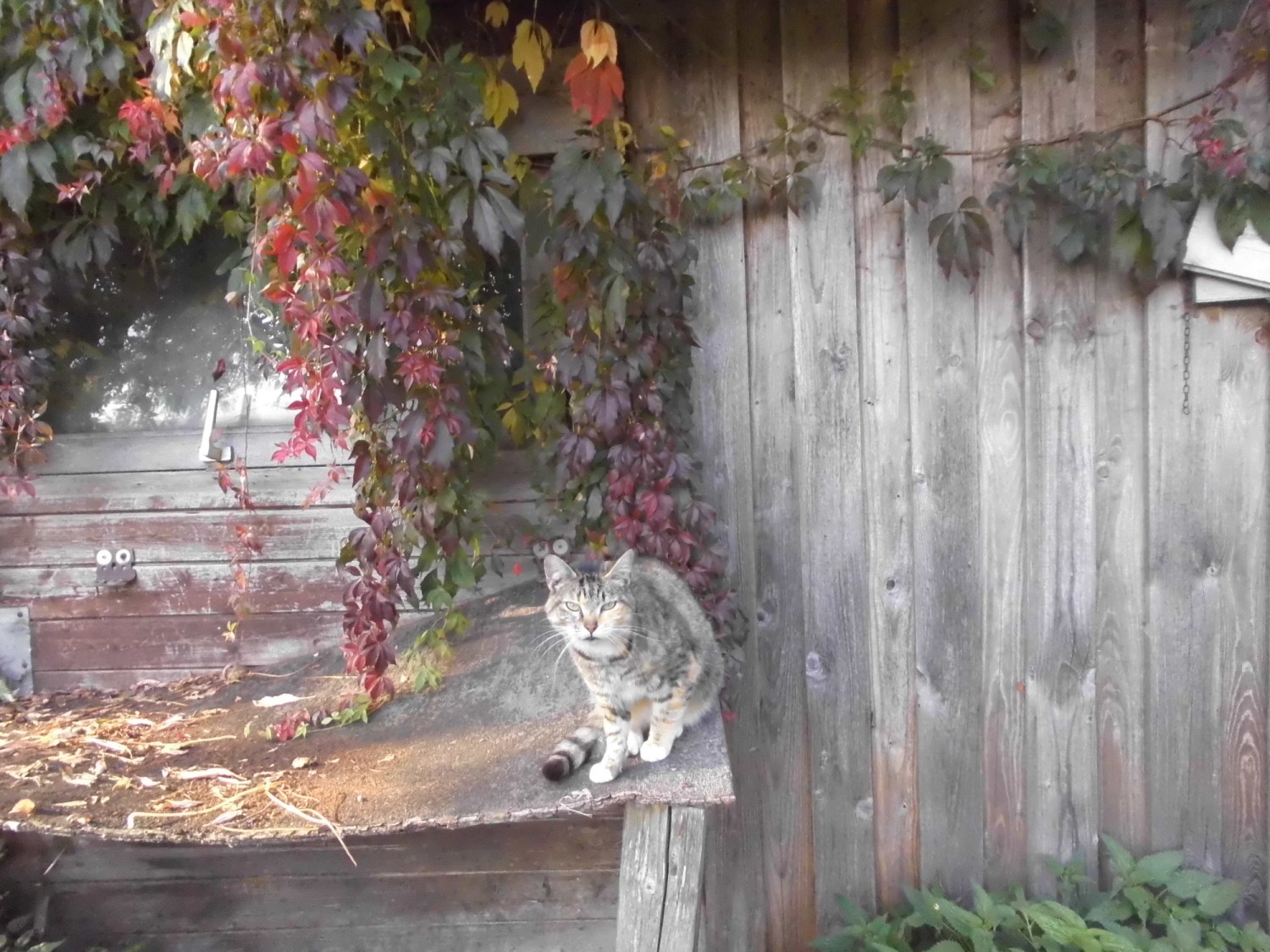 Katze Moni und Wilder Wein, in attraktiver Herbstfärbung. Ich meine natürlich die Pflanze mit der attraktiven Herbstfärbung und nicht die Katze. Die Katze ist das ganze Jahr über attraktiv gefärbt.