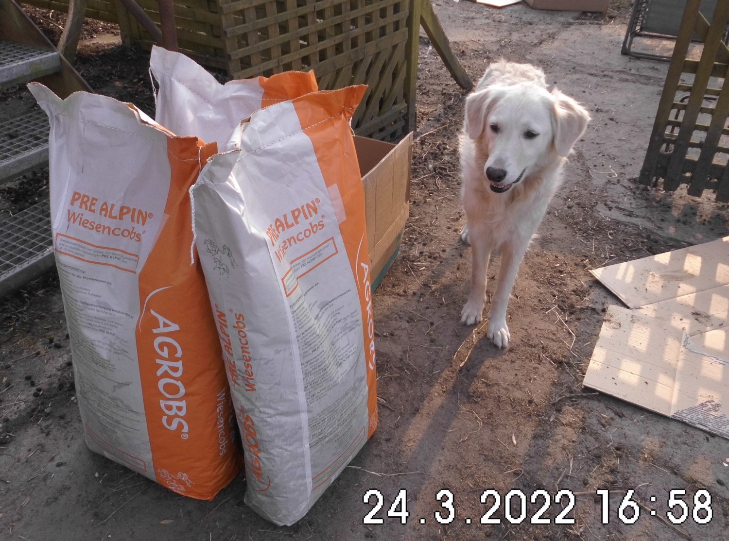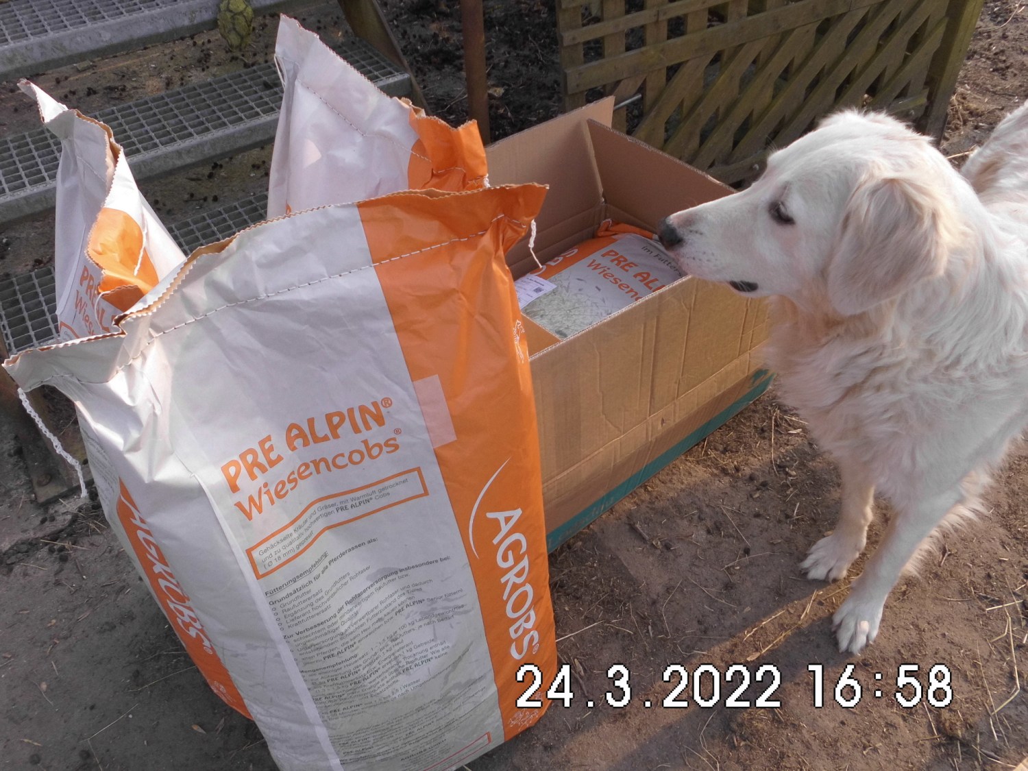 Pro Tag verfüttern wir einen Sack Wiesencobs. Bis Mitte Mai wird das so weiter gehen. Das sind noch 45 Tage. Uns fehlen aber noch 20 Säcke Pre Alpin Wisencobs.
