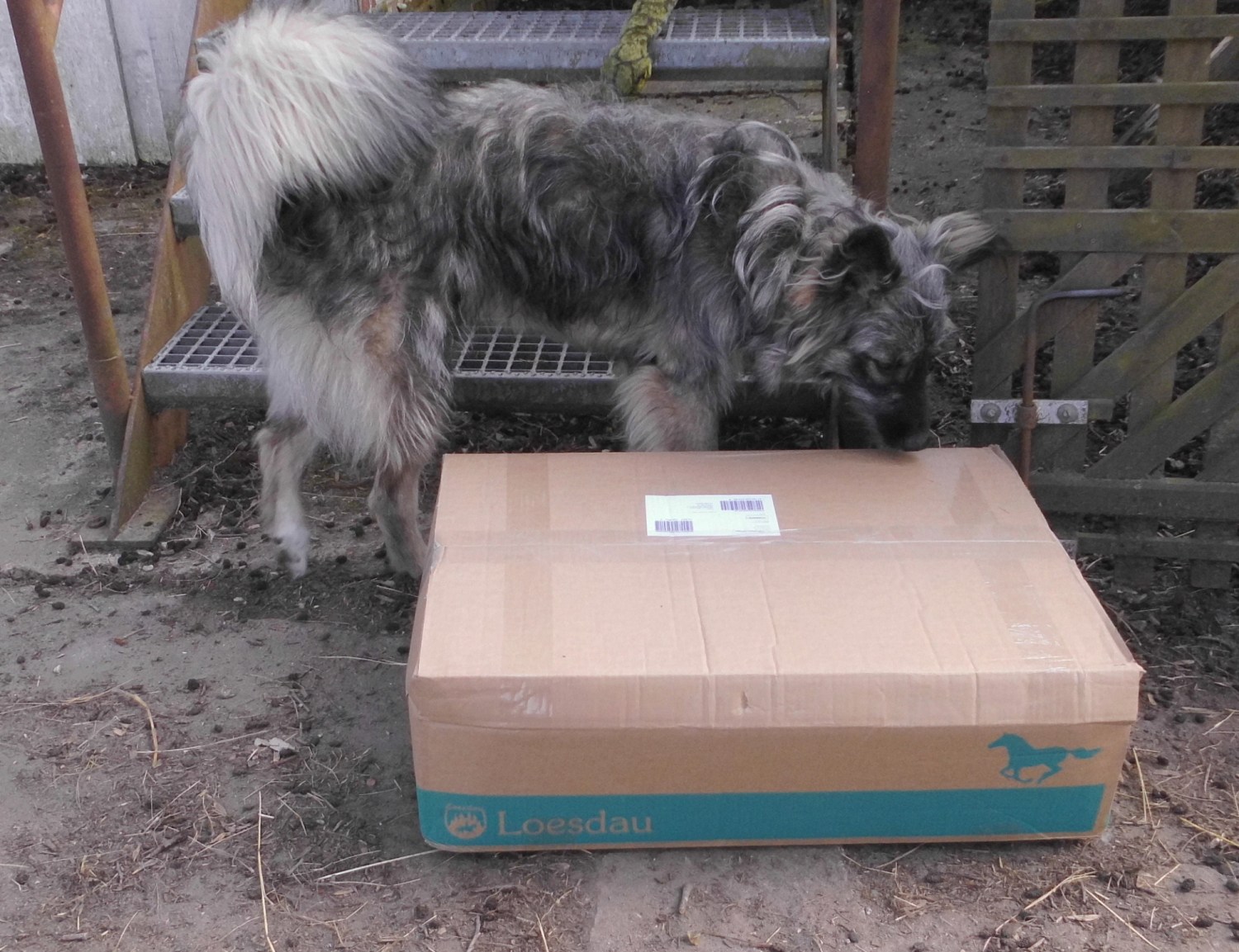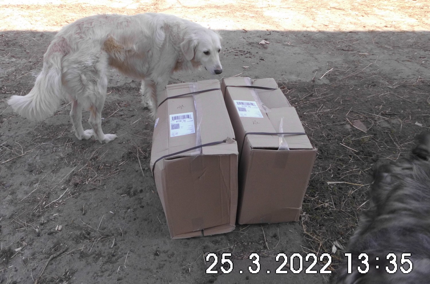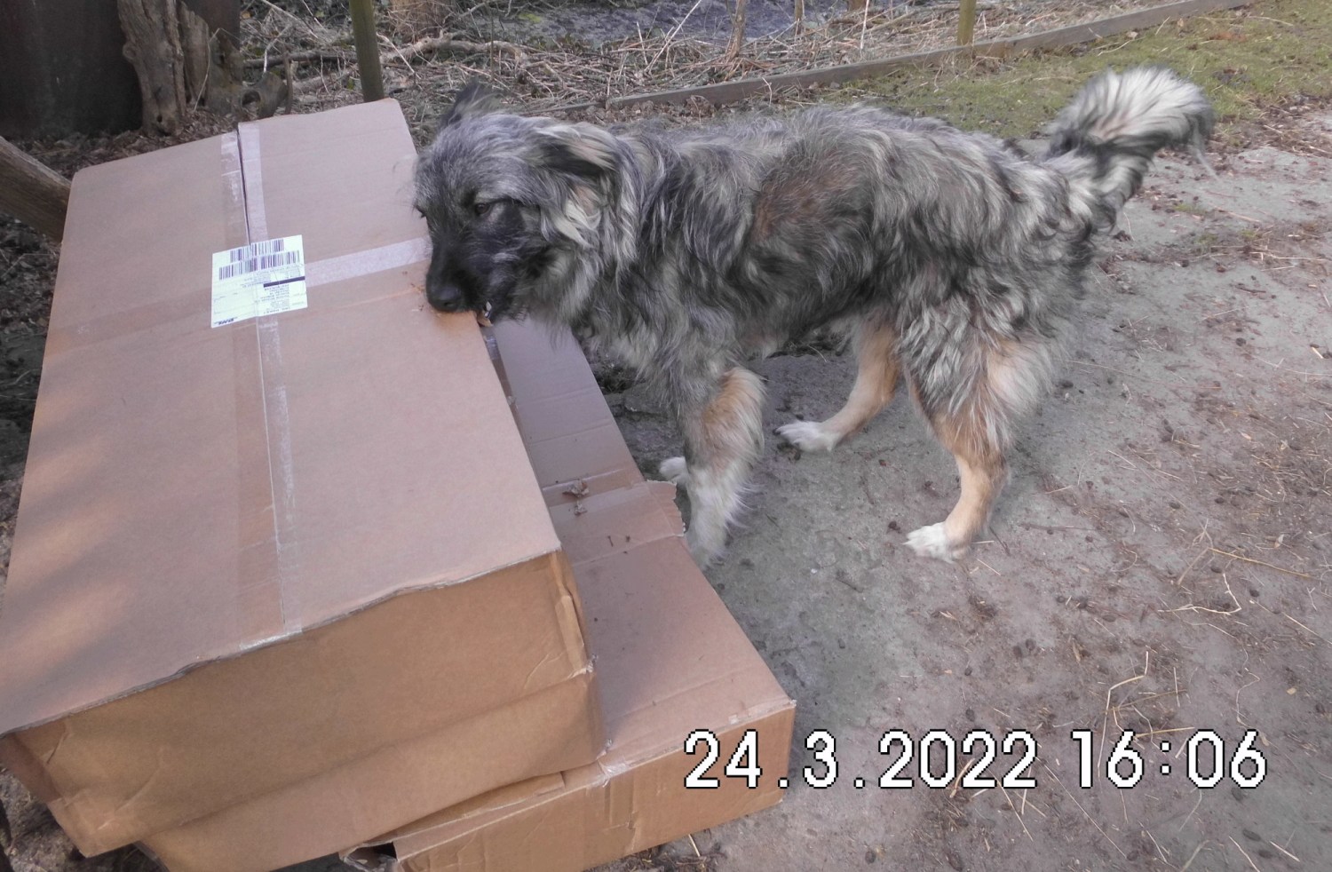 „Giada“ unser Herdenschutzhund im Wareneingang.„Marcy“ Wolfsspitz-Mix im Wareneingang.Ich helfe dir beim Auspacken! Niedlich gucken kann ich auch.„Giada“ die Vorarbeiterin und „Marcy“ Azubine. Etwas verbeulte die Karton, der Inhalt ist heil angekommen.So viele Kartons… der schnelle Eddi hatte gut zu tun.