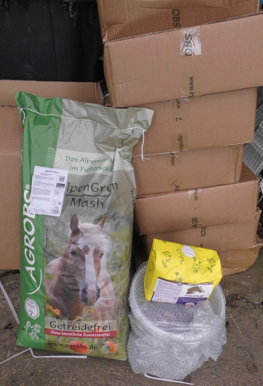 1 x Alpengrün Mash, 2 x Horse Alpin Senior, 5 x Pre Alpin Wiesencobs, 1 Eimer Kanne Energiebarren, 1 x Equipur Bronchialkräuter.