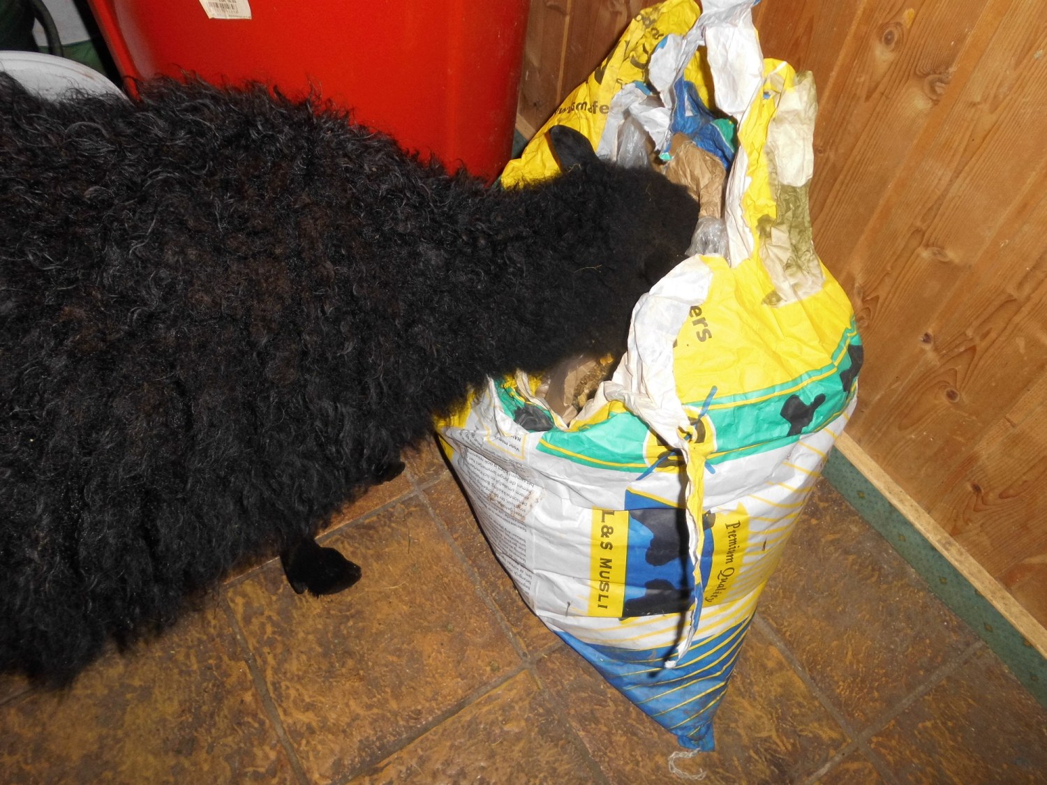 Kaum öffnet ich die Tür, ist Tinki-Winki im Haus verschwunden und hängt mit dem Kopf im Futtersack!