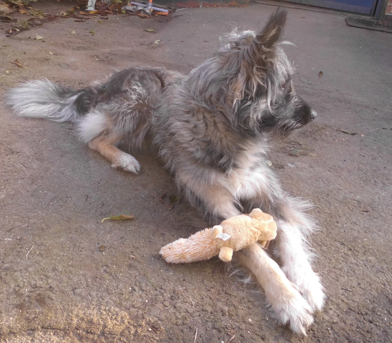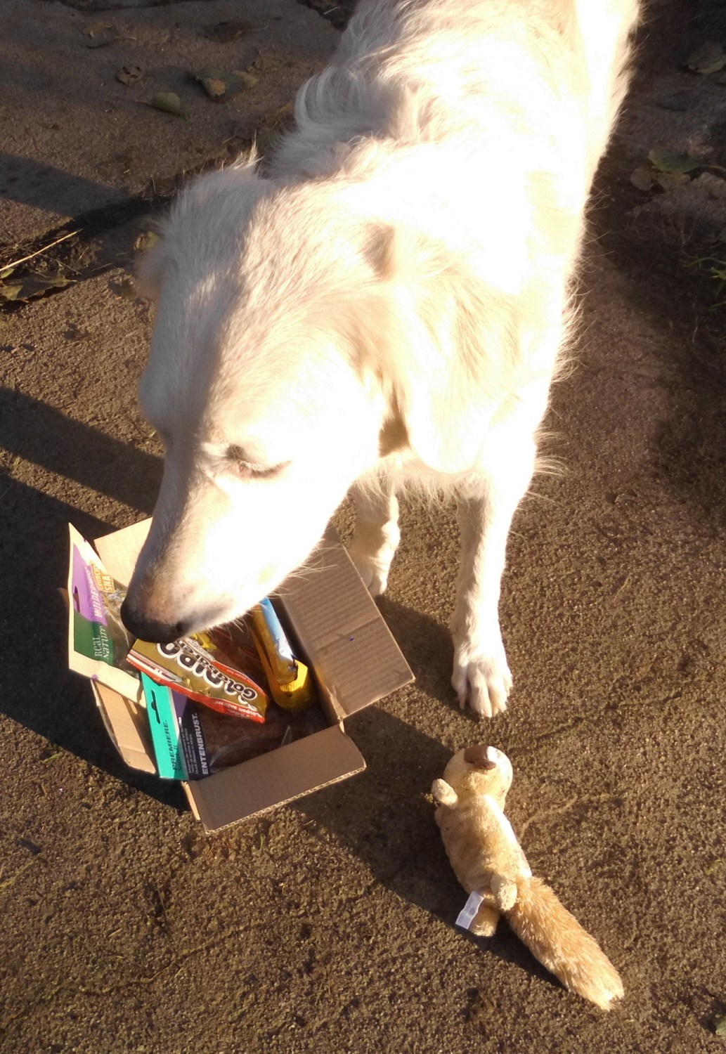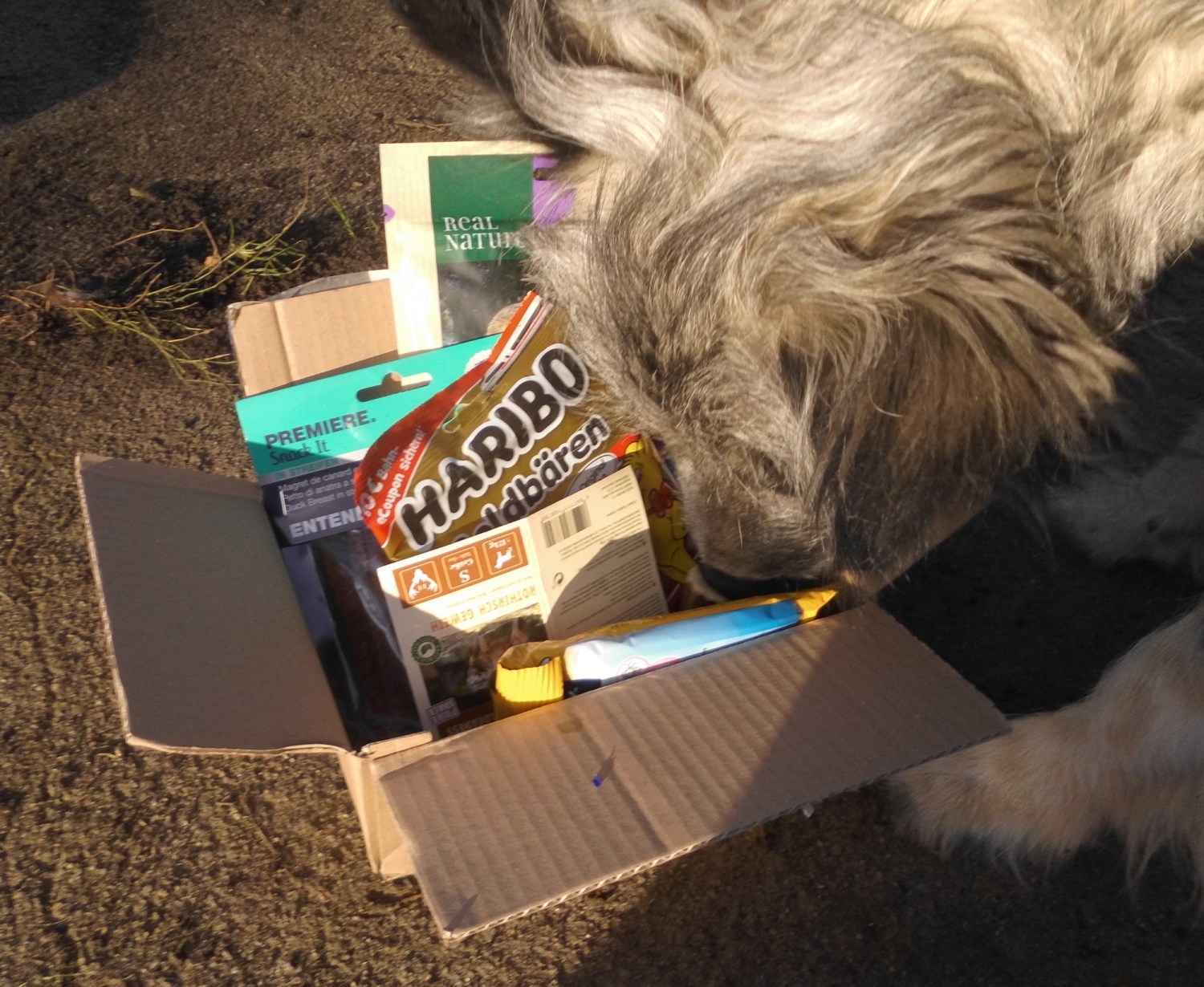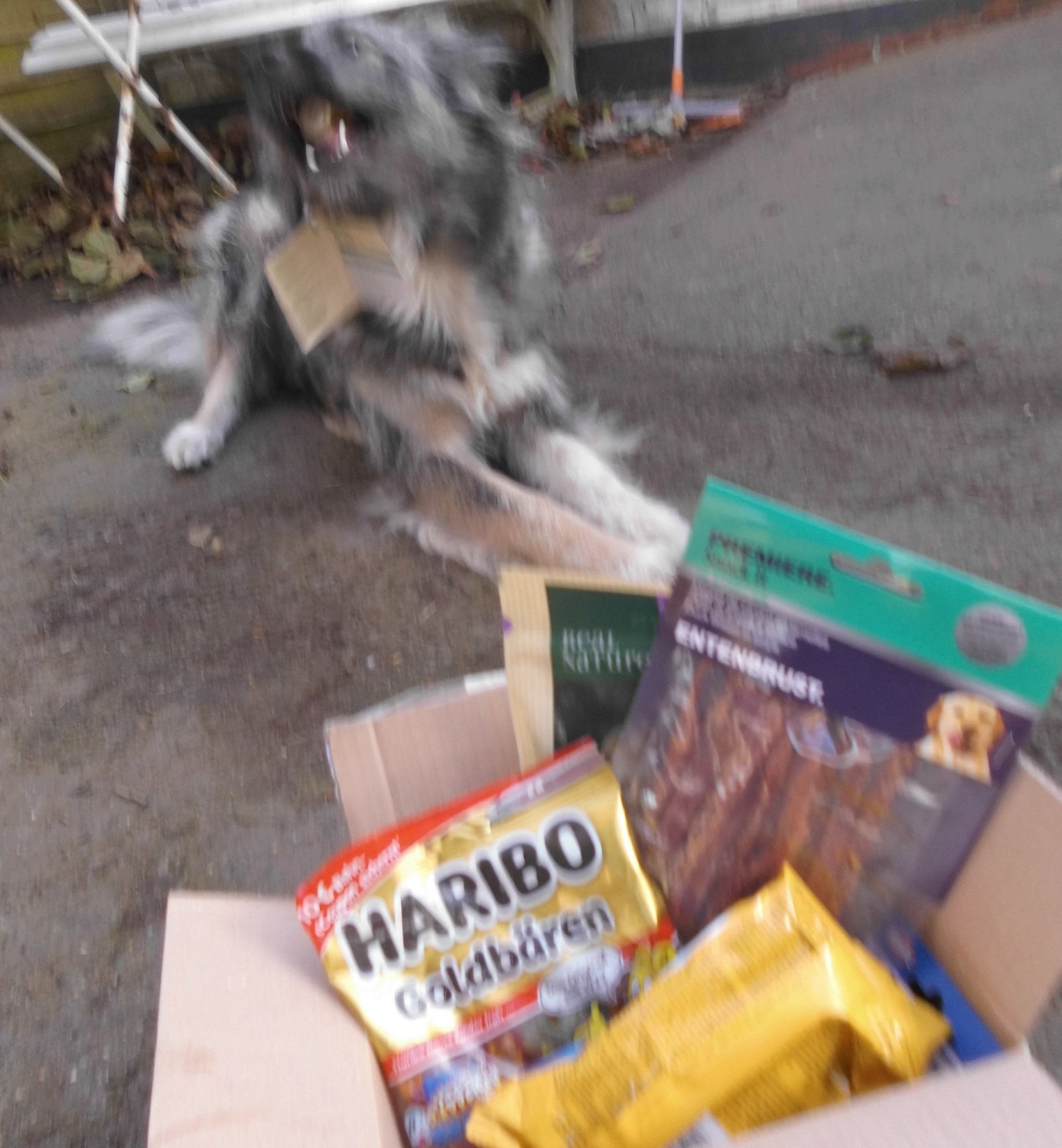 In dem Paket waren leckere Knabbersachen, auch ein Beutel für die Menschen, Spielzeug und eine 50.- Euro Spende.