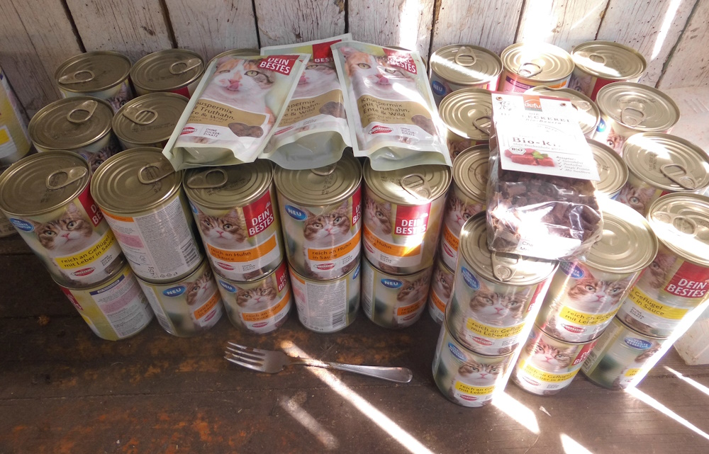 Ein befreundeter Tierschutzverein hat uns mit Katzenfutter, Katzen-Knabbertaschen und Leckerlies für unser bellendes Wachpersonal unterstützt!