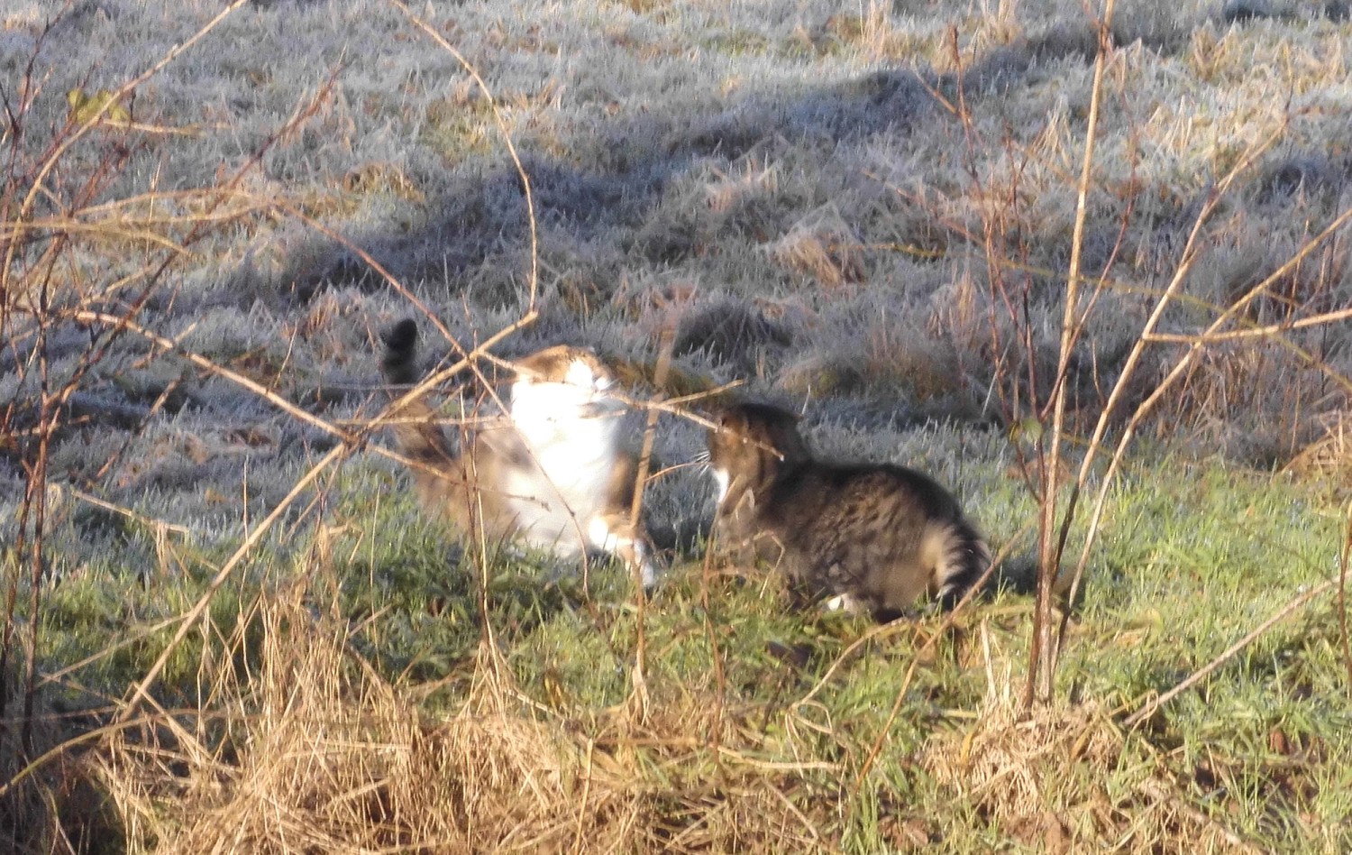 Noch mal typisch Katze: Erst liegen sie beieinander und lecken sich die Köpfe. Plötzlich knallt die eine der anderen eine und das Geschrei ist groß. 🙂