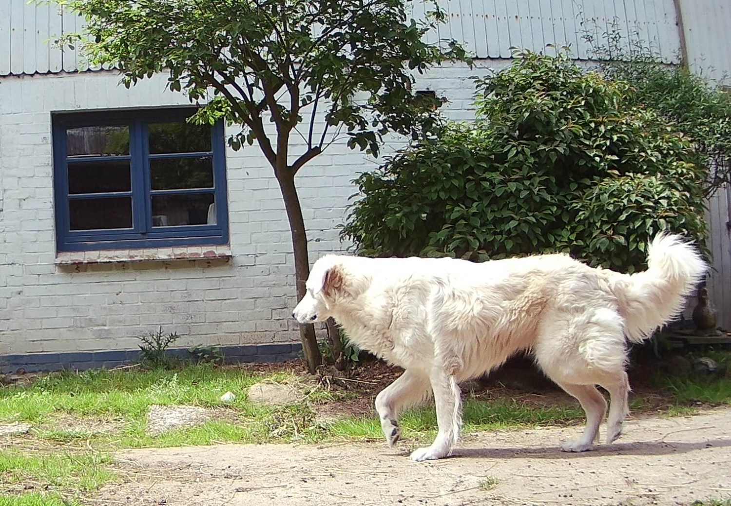Giada ist ein italienischer Herdenschutzhund, ein Maremmano Mix. Was außer dem Maremmano noch in Giada stecken mag, können wir nicht sagen. Sie hat auf alle Fälle sehr viele Herdenschutzhund-Eigenschaften. Giada wuchs in einem Zwinger ohne Außenkontakte auf. Sie war ein Jahr alt und nicht sozialisiert als sie zu uns kam. Das ist bei Herdenschutzhunden problematisch.