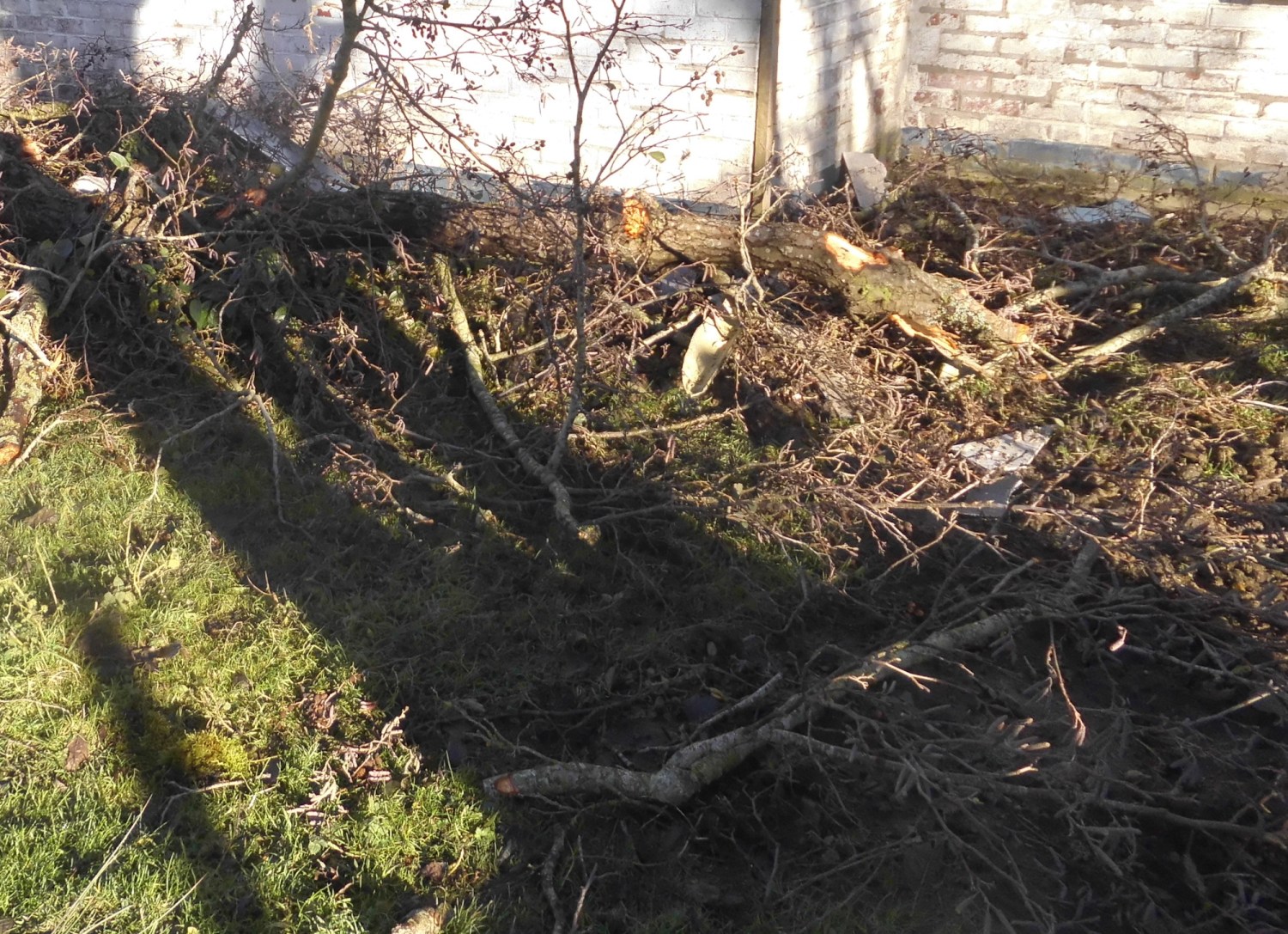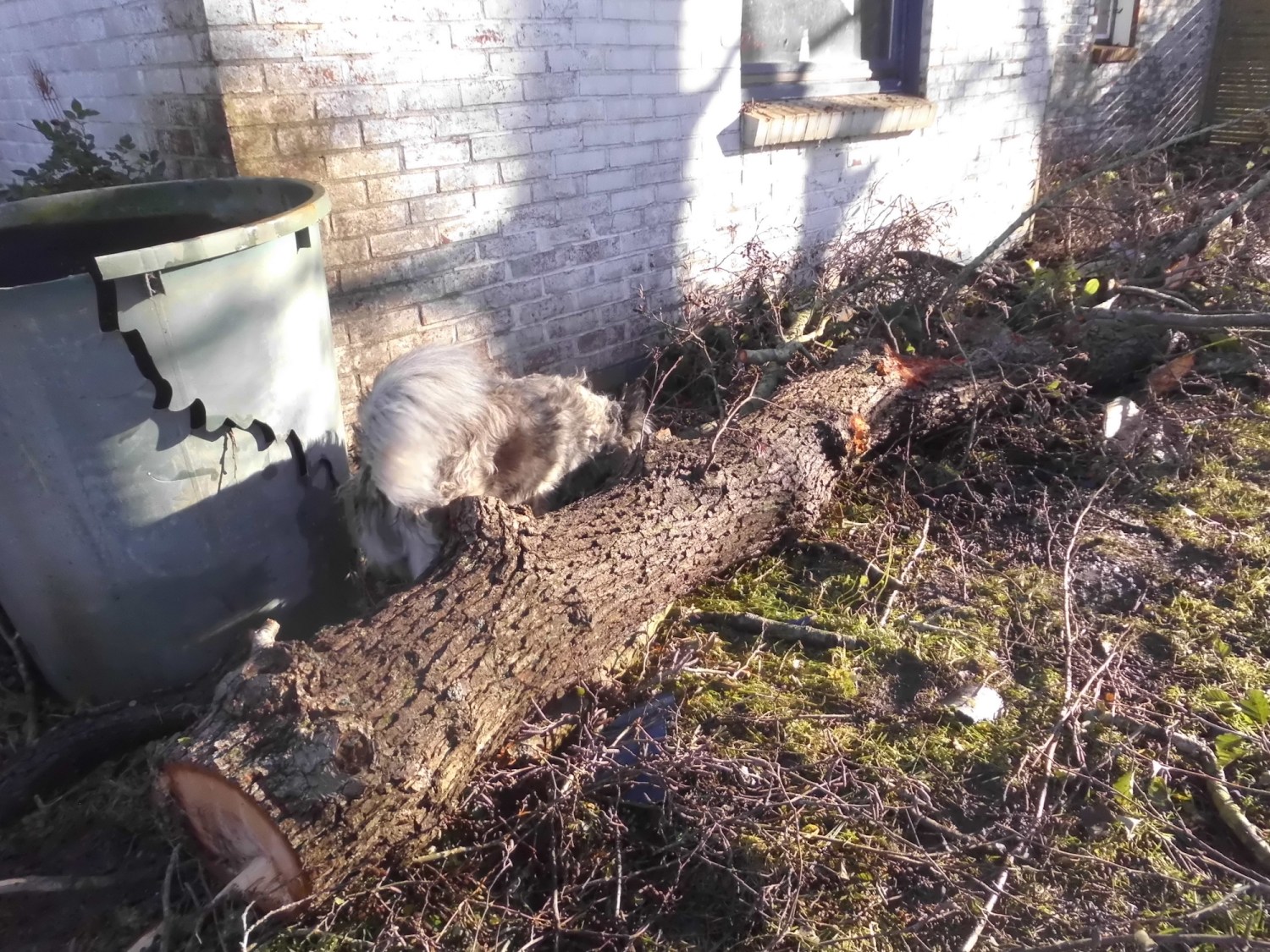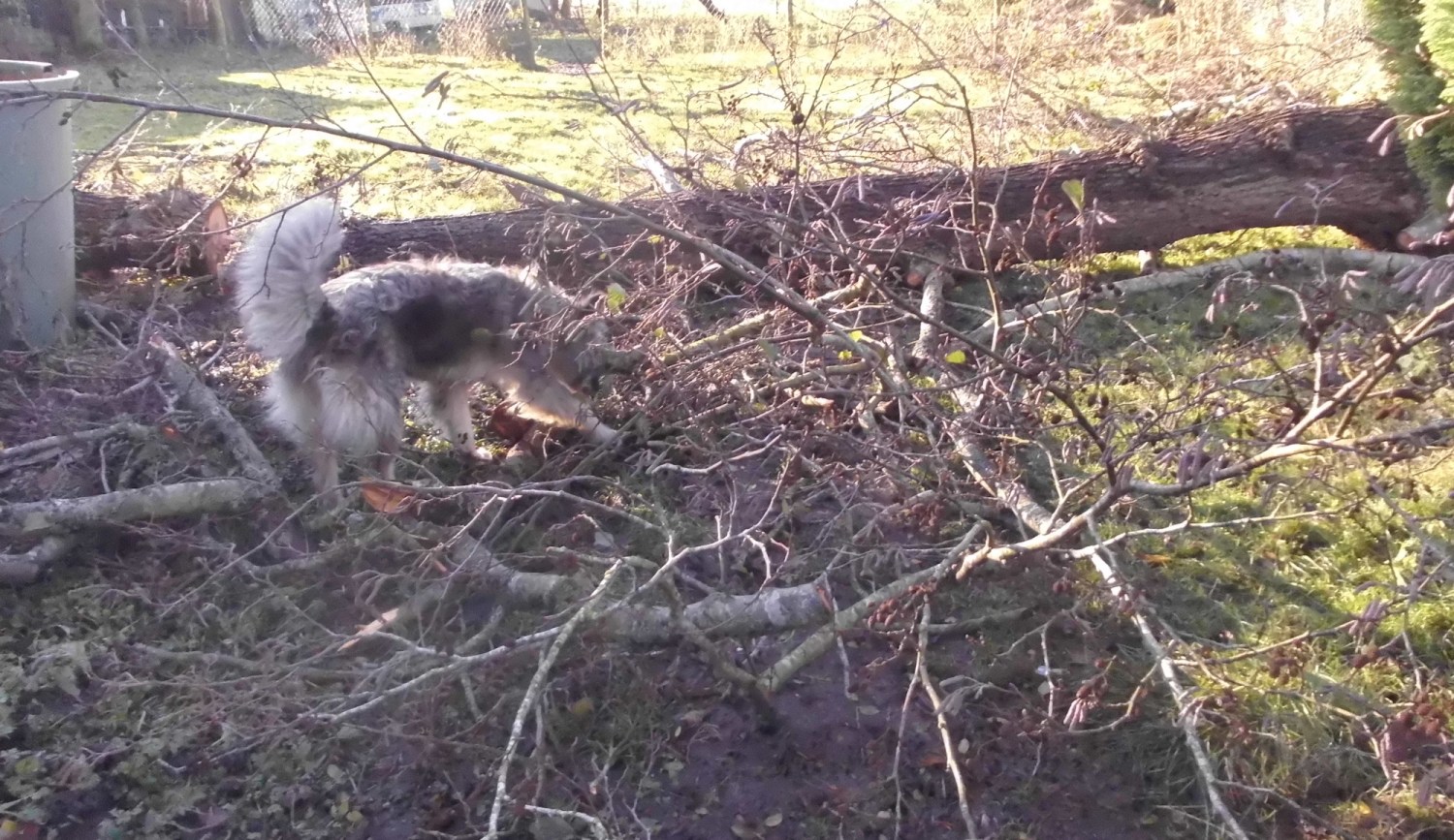 Leider ist der Baum auf unsere große Regentonne gefallen. Die hat es nicht überlebt.