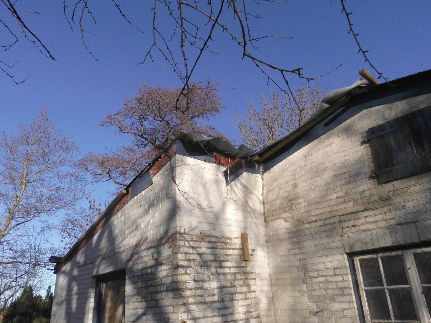 Der Schaden ist größer als gedacht. Es sind große Löcher im Dach, das Mauerwerk und noch irgendwas ist beschädigt. Die Teile liegen überall im Garten herum.