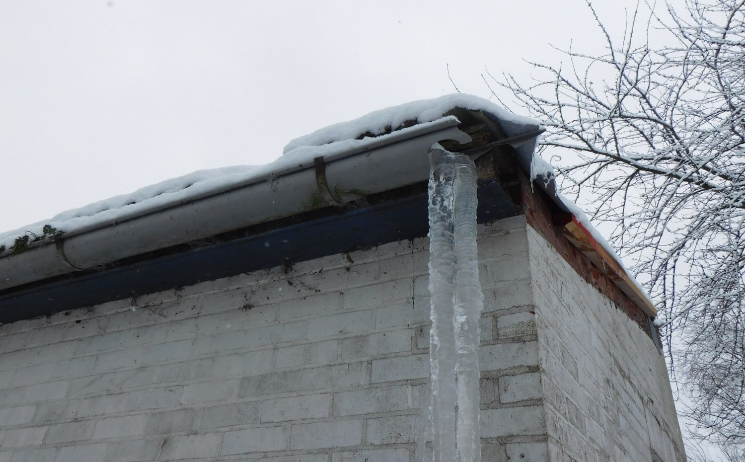 Hier kommt ein Foto von Anfang Dezember. Die Regenrinne hat der Baum auch geschrottet. Ich fand das Eis so faszinierend.