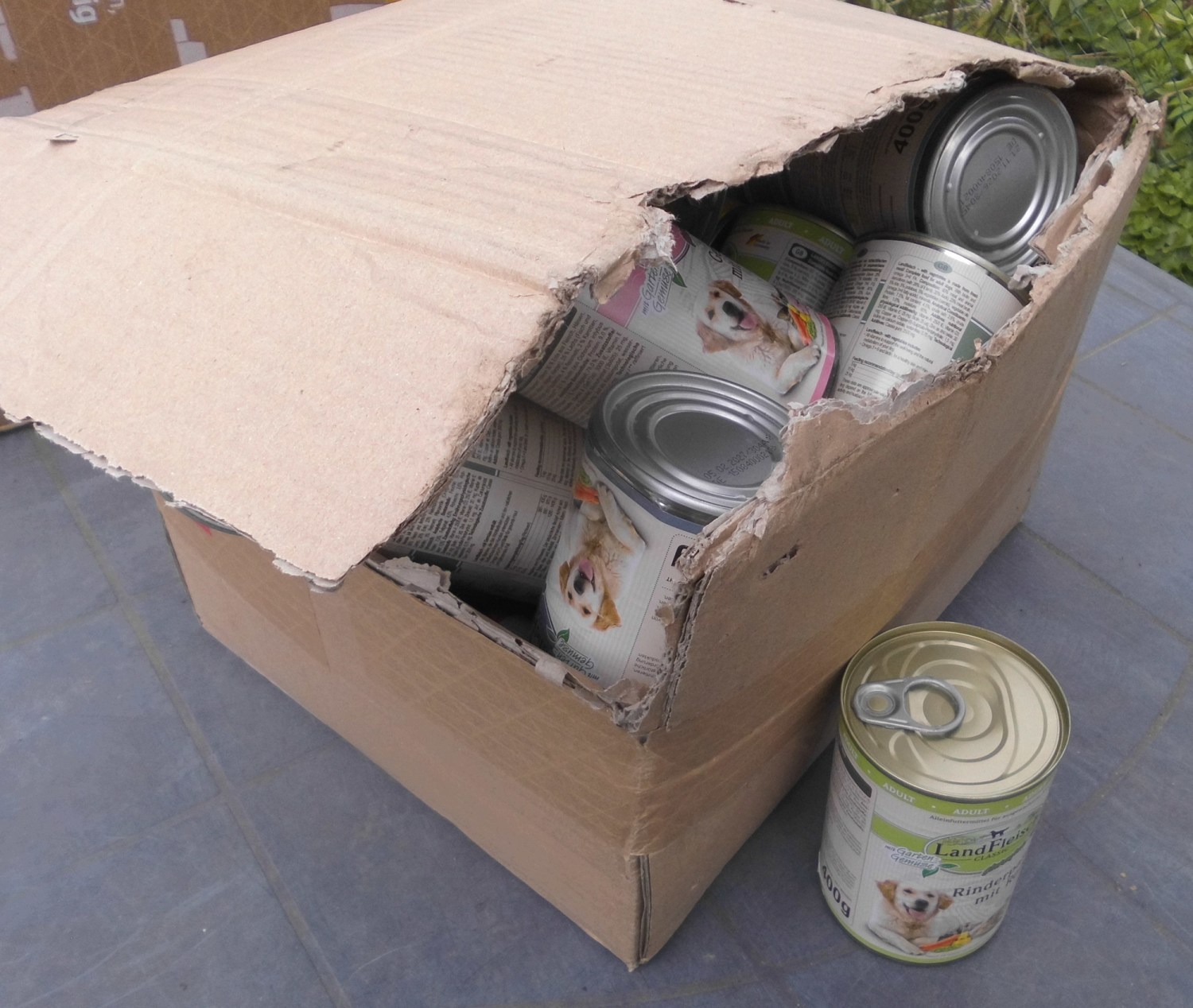 Vielen Dank liebe Mathilda für Deine Unterstützung! ❤ Ist es nicht geradezu ein Wunder, dass alle Dosen angekommen sind. Vom Karton waren noch noch ein paar Fetzen übrig. 😀 Die auf dem Postzentrum wissen abe rauch, dass Tierfutterdosen für uns sind. Vielleicht haben sie die lose herum fliegenden Dosen eingesammelt?