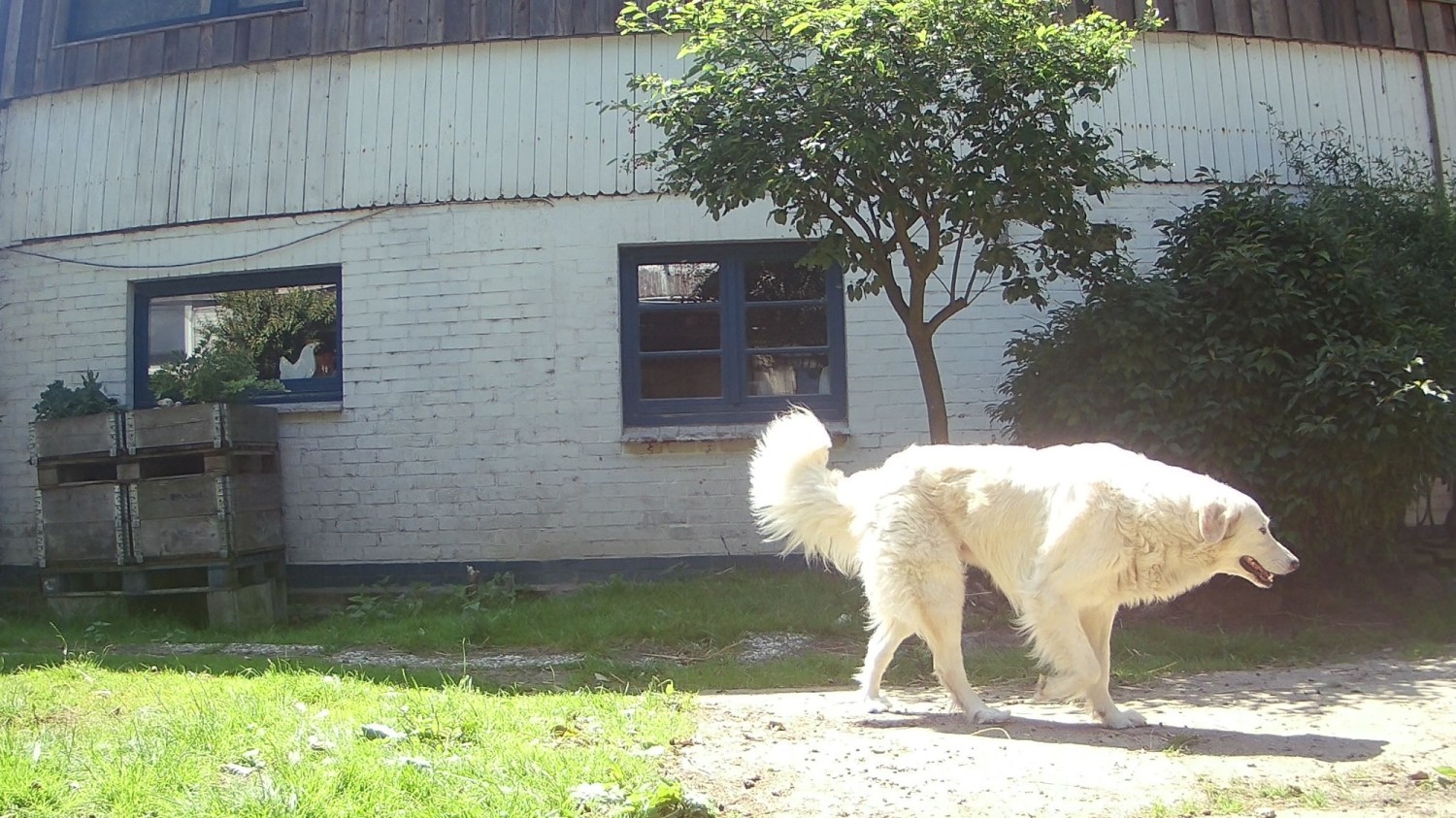Giada läuft frei auf dem Hof herum und kann ihrer Veranlagung als Herdenschutzhund nachgehen, die Herde zu bewachen.