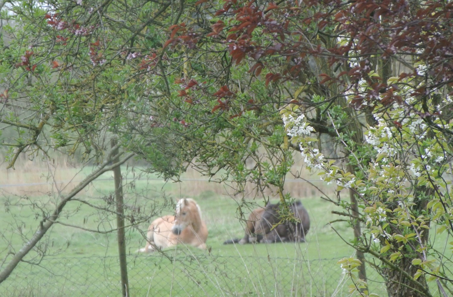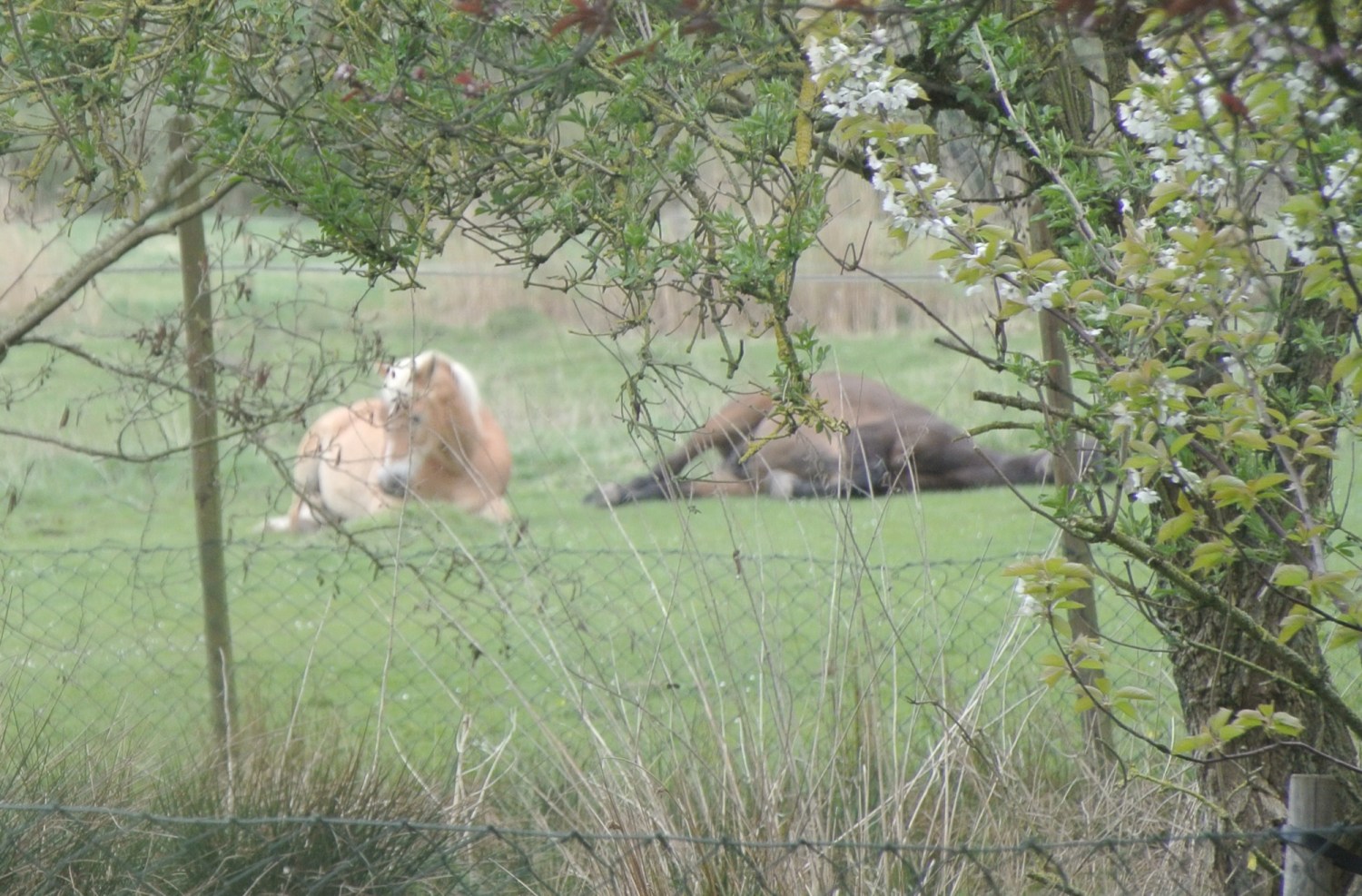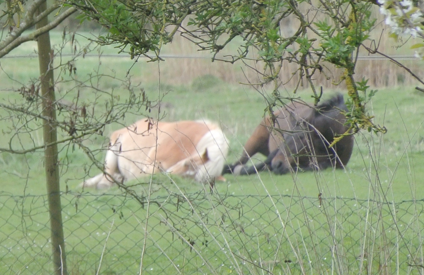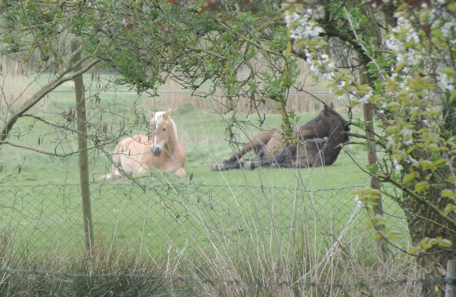 Gestern habe ich die Pferde zum ersten Mal, nebeneinander liegend, auf der Weide schlafen gesehen. Sonst steht immer ein Pferd, während das andere liegt. Das hat auch etwas mit dem Fluchttier Pferd zu tun. Einer muss sozusagen immer Wache halten.