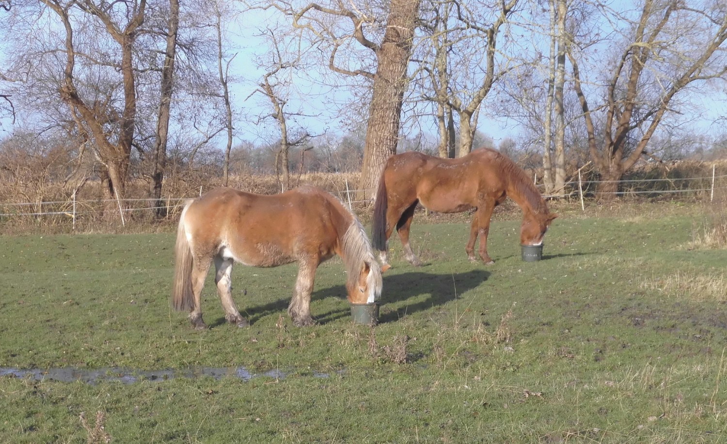 Nicht nur die Futterzubereitung dauert, auch die Fütterung selbst kostet enorm viel Zeit. Miranda frisst langsam, sehr langsam. Immer langsamer. Nielsson ist viel schneller mit seiner Portion fertig. Er würde die Stute vom Futter verscheuchen, wenn ich nicht daneben stehen bliebe.