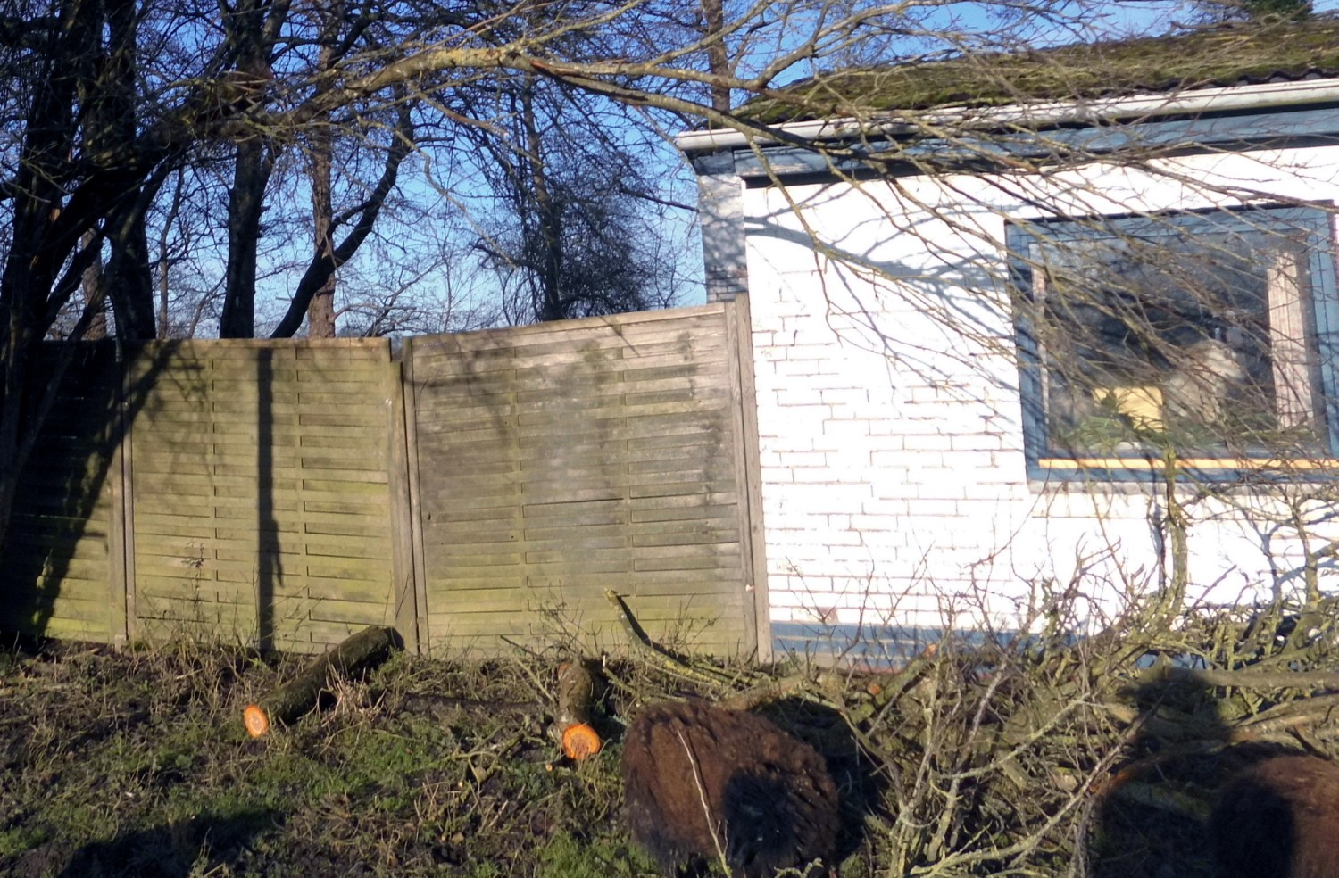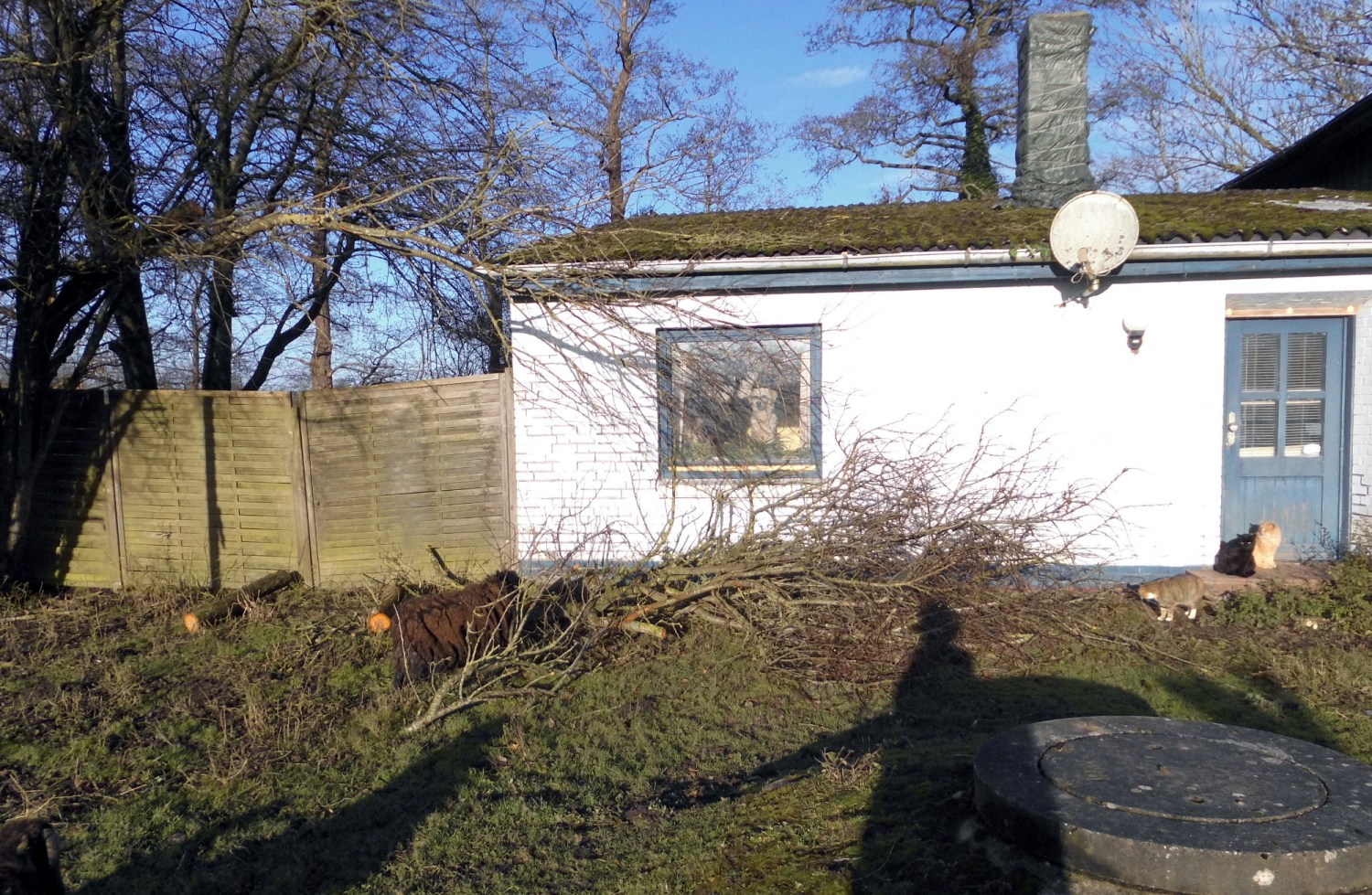 Am Nachmittag fiel dann ein Baum um und landete halb auf dem Dach des Wohnhauses. Dort lag er, drückte die Regenrinne nach unten und seine Äste wurden vom Wind hin und her geweht. Liegen bleiben konnte nicht, dann hätte er noch mehr geschädigt. Mit guter Nachbarschaftshilfe konnten wir ihn dann vom Doch entfernen.