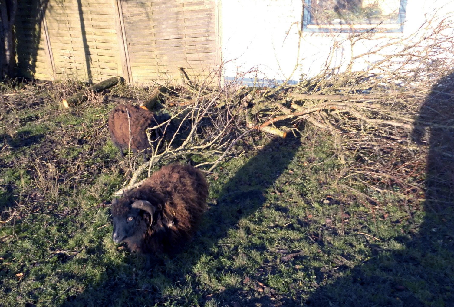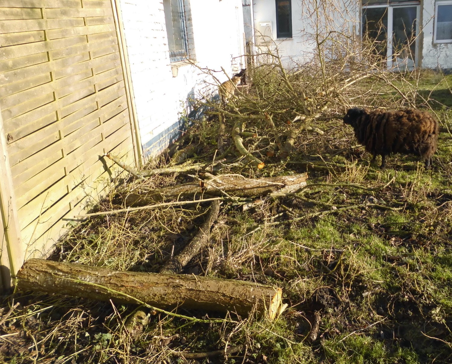 Überall lagen Äste und Baumteile herum. Die lange Einfahrt, der Innenhof, der Garten, die drei Schafweiden, alles musste aufgeräumt werden.