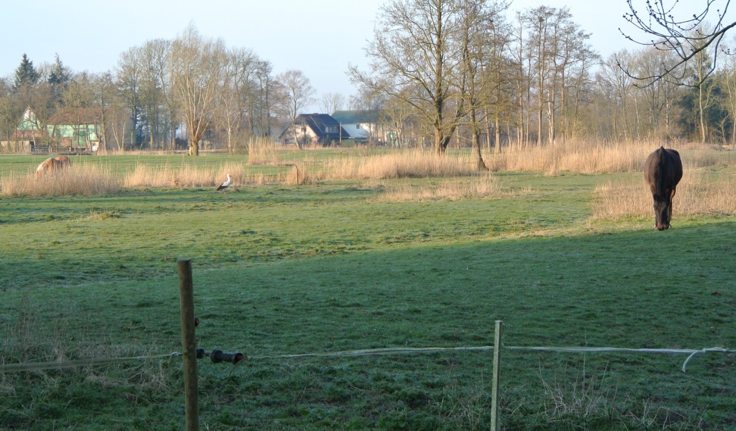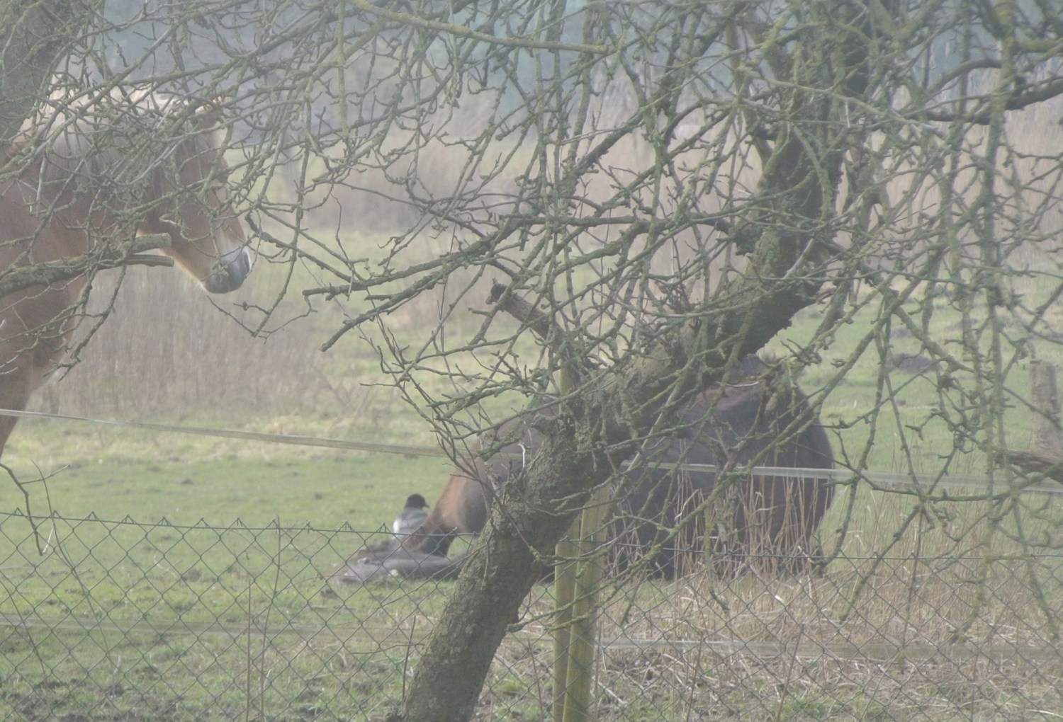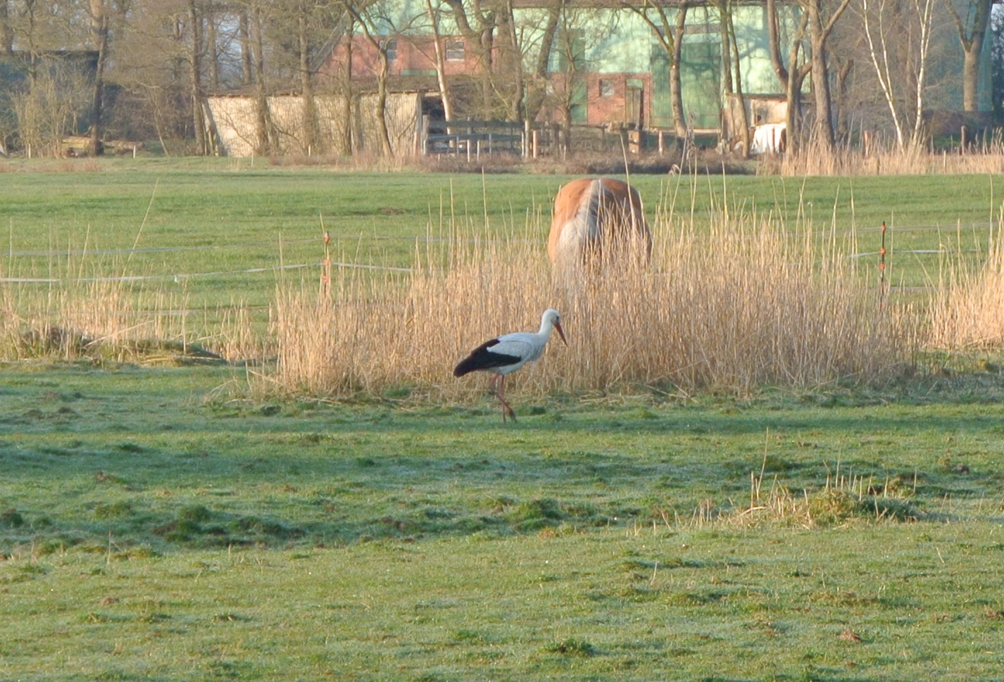 Heute morgen waren auf unserer Weide, zwei Störche, die lustig zwischen den Pferden herumliefen. Bis ich meine Kamera geholt hatte, war einer der Störche auf das Nachbarstück geflogen.